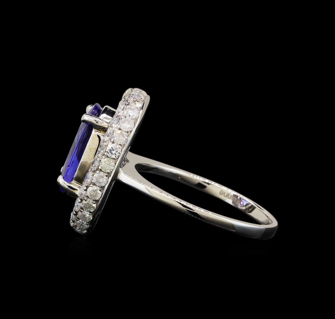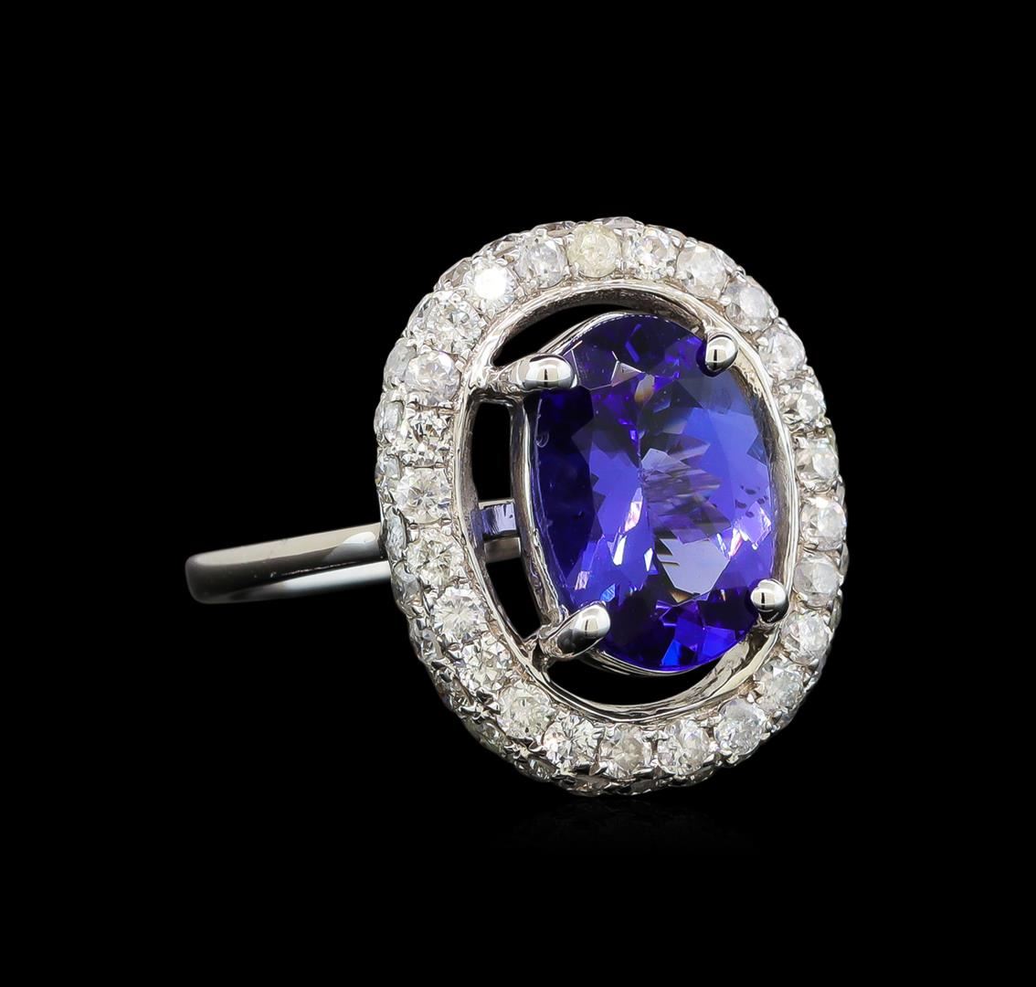 One electronically tested 14KT white gold ladies cast tanzanite and diamond ring with a flat shank with a bright polish finish. Trademark is Orianne. Identified with markings of "14K". Condition is new. Containing: One prong set oval modified brilliant cut natural tanzanite, measuring 11.20 x 7.60 x 4.94mm, approximate weight of 2.96ct., clarity is eye clean, type I, medium, very slightly grayish, bluish violet color, (GIA bV 5/3), cut is good. Fifty-Four prong set round brilliant cut diamonds, measuring 1.80 - 1.80 x 1.08mm (depth est.) approximate total weight of 54 Stones = 1.15ct. Clarity: I-1 to I-2. Color: I - J. All diamonds and colored gemstones are graded in the mounting, unless otherwise stated. Colored gemstones are presumed to have been subjected to commonly used enhancement processes. Total Weight of Colored Stones 2.96ct. Total Weight of Diamonds 1.15ct. Total Weight of Ring 4.80 grams. GGL Appraised at $4,985.00.
