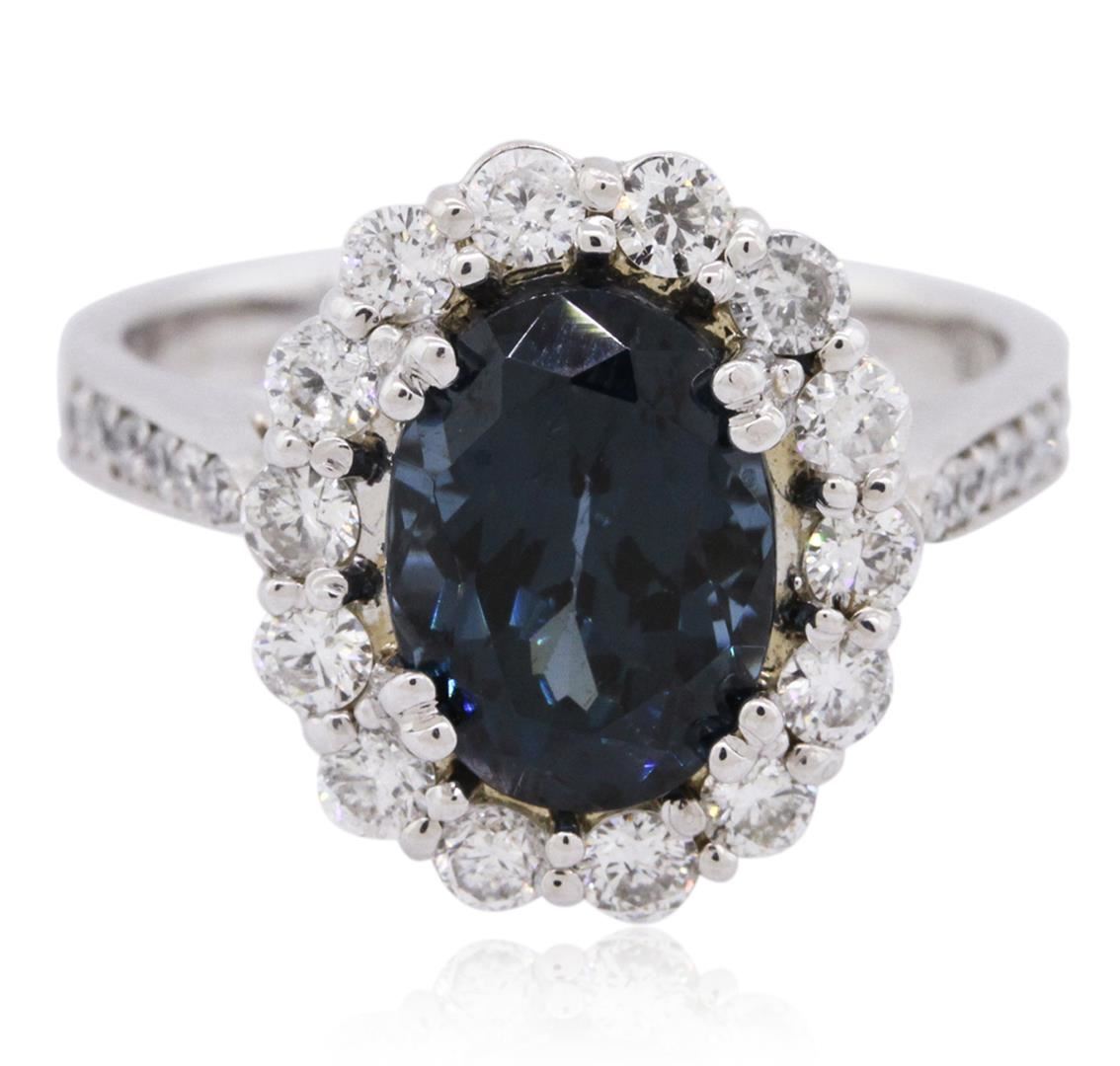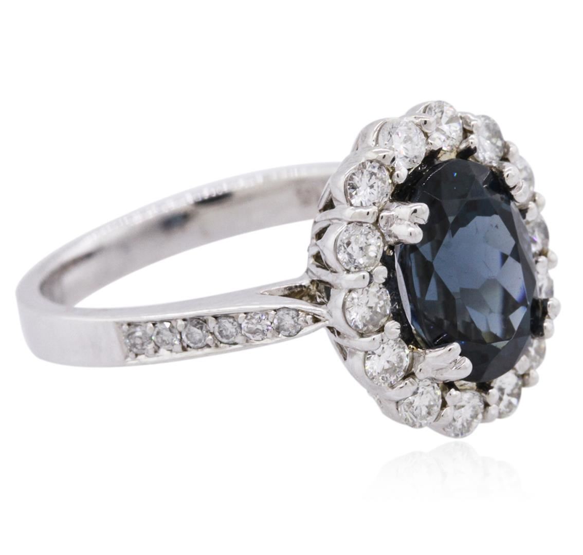 One electronically tested 14KT white gold ladies cast blue spinel and diamond ring with a bright polish finish. The featured blue spinel is set within a diamond bezel supported by diamond set shoulders, completed by a two and one-half millimeter wide band. Identified with markings of "K14". Condition is new, good workmanship. Containing: One prong set oval mixed cut natural blue spinel, measuring 9.80 x 7.15 x 5.40mm, 6%. bulge factor, approximate weight of 2.96ct., clarity is eye clean, type II, dark, very slightly grayish, very slightly greenish blue color, (GIA vslgB 7/3), cut is good. Transmitting light with no distortion, transparent. Refractive index testing results of 1.72. This is a conclusive result for spinel. Graded in the setting. Fourteen prong set round brilliant cut diamonds, measuring 2.20 - 2.10 x 1.29mm (depth est.) approximate total weight of 14 Stones = 0.60ct. Graded in the setting. Clarity: SI-1 to I-1. Color: H - J Twelve prong set round brilliant cut diamonds, measuring 1.20 - 1.10 x 0.69mm (depth est.) approximate total weight of 12 Stones = 0.10ct. Graded in the setting. Clarity: I-1 to I-2. Color: G - I. Total Weight of Colored Stones 2.96ct. Total Weight of Diamonds 0.70ct. Total Weight of Ring 5.18 grams. AIG Appraised at $4,070.00.