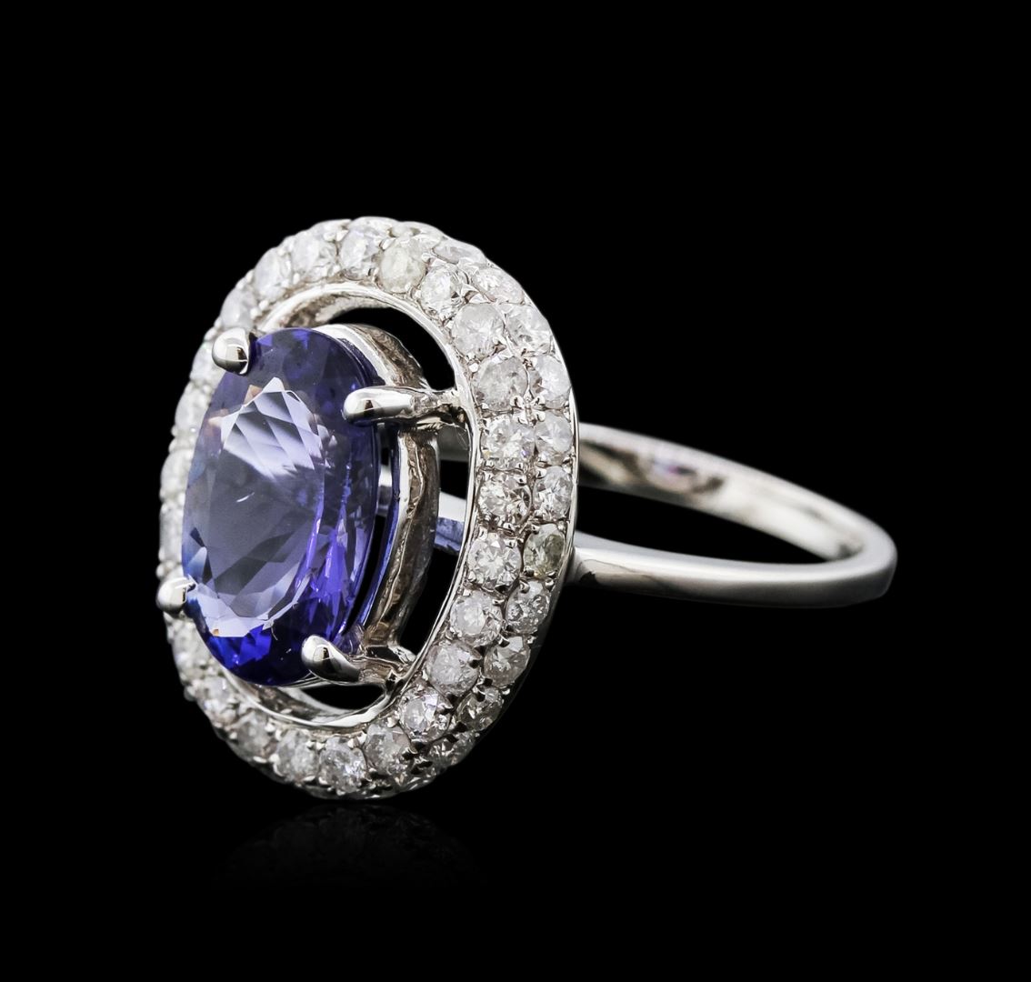 One electronically tested 14KT white gold ladies cast tanzanite and diamond ring with a flat shank with a bright polish finish. Trademark is Orianne. Identified with markings of "14K". Condition is new. Containing: One prong set oval modified brilliant cut natural tanzanite, measuring 11.20 x 7.60 x 4.94mm, approximate weight of 2.96ct., clarity is eye clean, type I, medium, very slightly grayish, bluish violet color, (GIA bV 5/3), cut is good. Fifty-Four prong set round brilliant cut diamonds, measuring 1.80 - 1.80 x 1.08mm (depth est.) approximate total weight of 54 Stones = 1.15ct. Clarity: I-1 to I-2. Color: I - J. All diamonds and colored gemstones are graded in the mounting, unless otherwise stated. Colored gemstones are presumed to have been subjected to commonly used enhancement processes. Total Weight of Colored Stones 2.96ct. Total Weight of Diamonds 1.15ct. Total Weight of Ring 4.80 grams. GGL Appraised at $4,985.00.