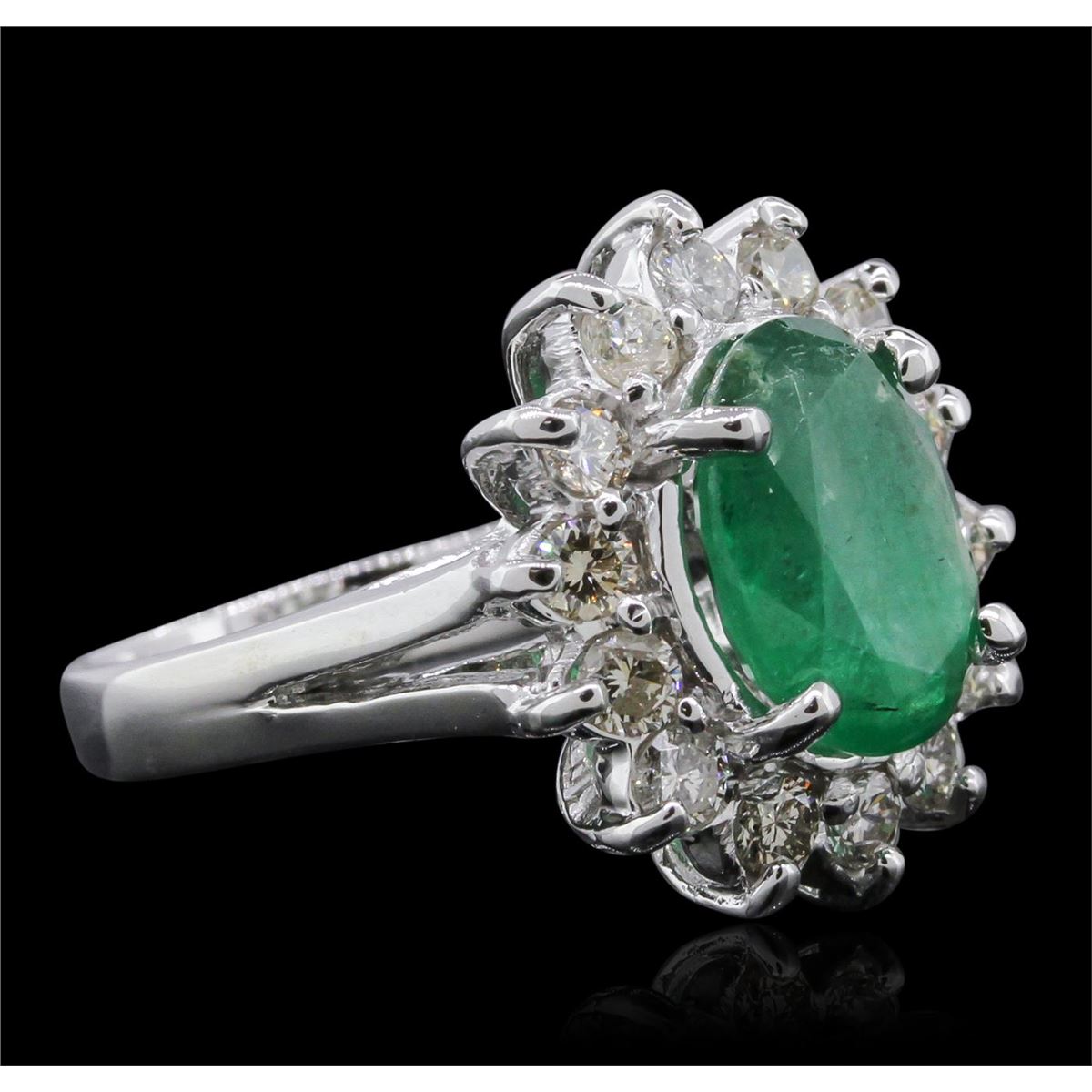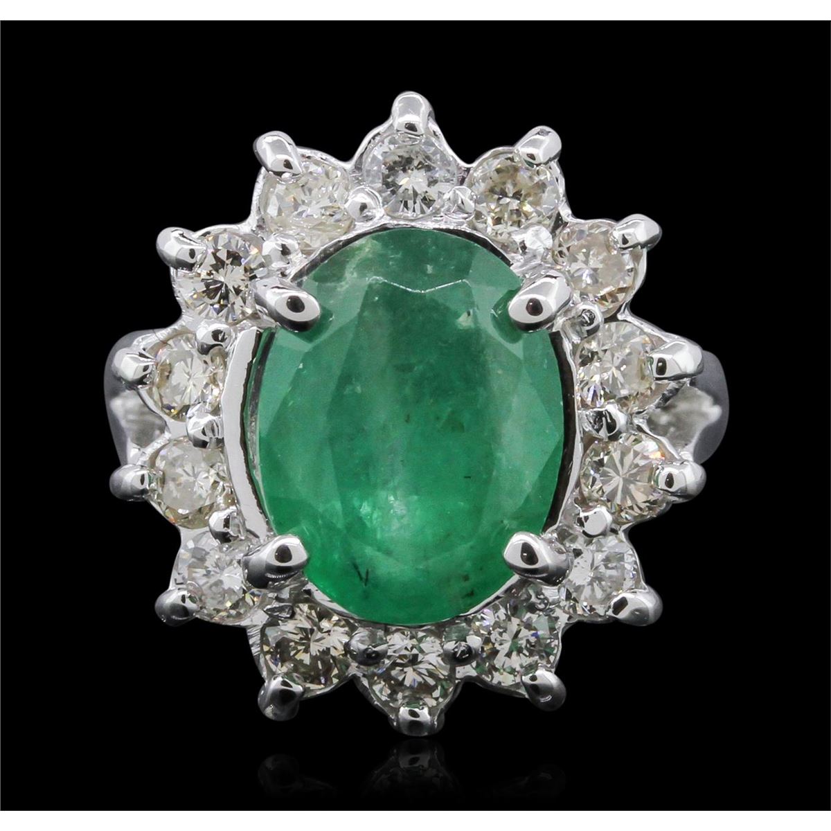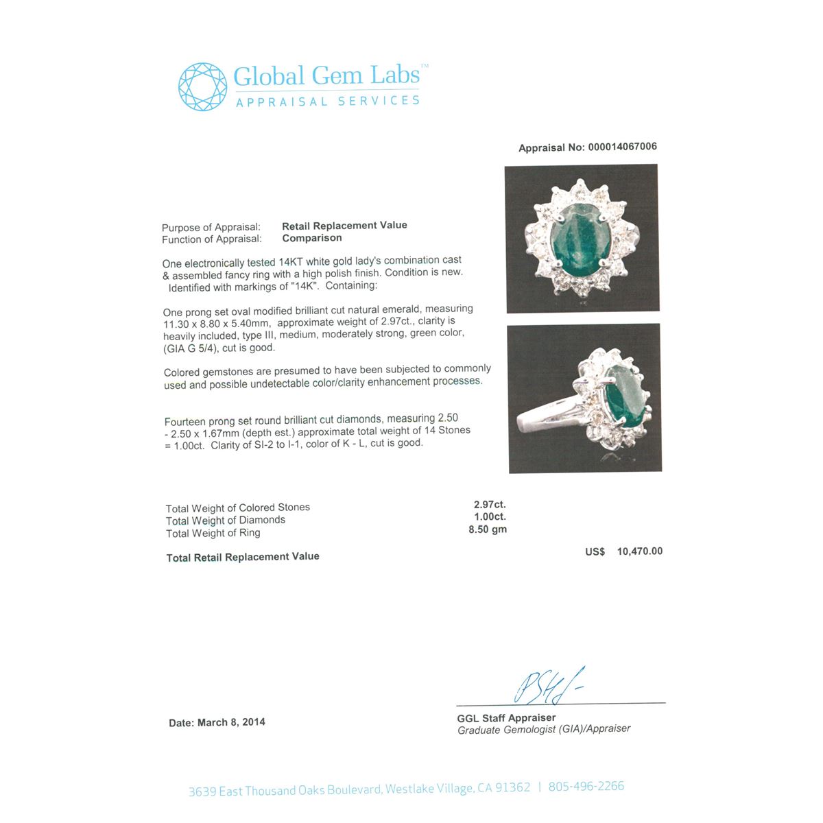 One electronically tested 14KT white gold Ladies combination cast & assembled fancy ring with a high polish finish. Condition is new. Identified with markings of "14K". Containing: One prong set oval modified brilliant cut natural emerald, measuring 11.30 x 8.80 x 5.40mm, approximate weight of 2.97ct., clarity is heavily included, type III, medium, moderately strong, green color, (GIA G 5/4), cut is good. Colored gemstones are presumed to have been subjected to commonly used and possible undetectable color/clarity enhancement processes. Fourteen prong set round brilliant cut diamonds, measuring 2.50 - 2.50 x 1.67mm (depth est.) approximate total weight of 14 Stones = 1.00ct. Clarity of SI-2 to I-1, Color of K - L, Cut is Good. Total Weight of Colored Stones 2.97ct. Total Weight of Diamonds 1.00ct. Total Weight of Ring 8.50 grams. GGL Appraised at $10,470.00.