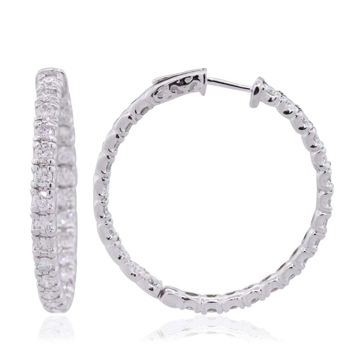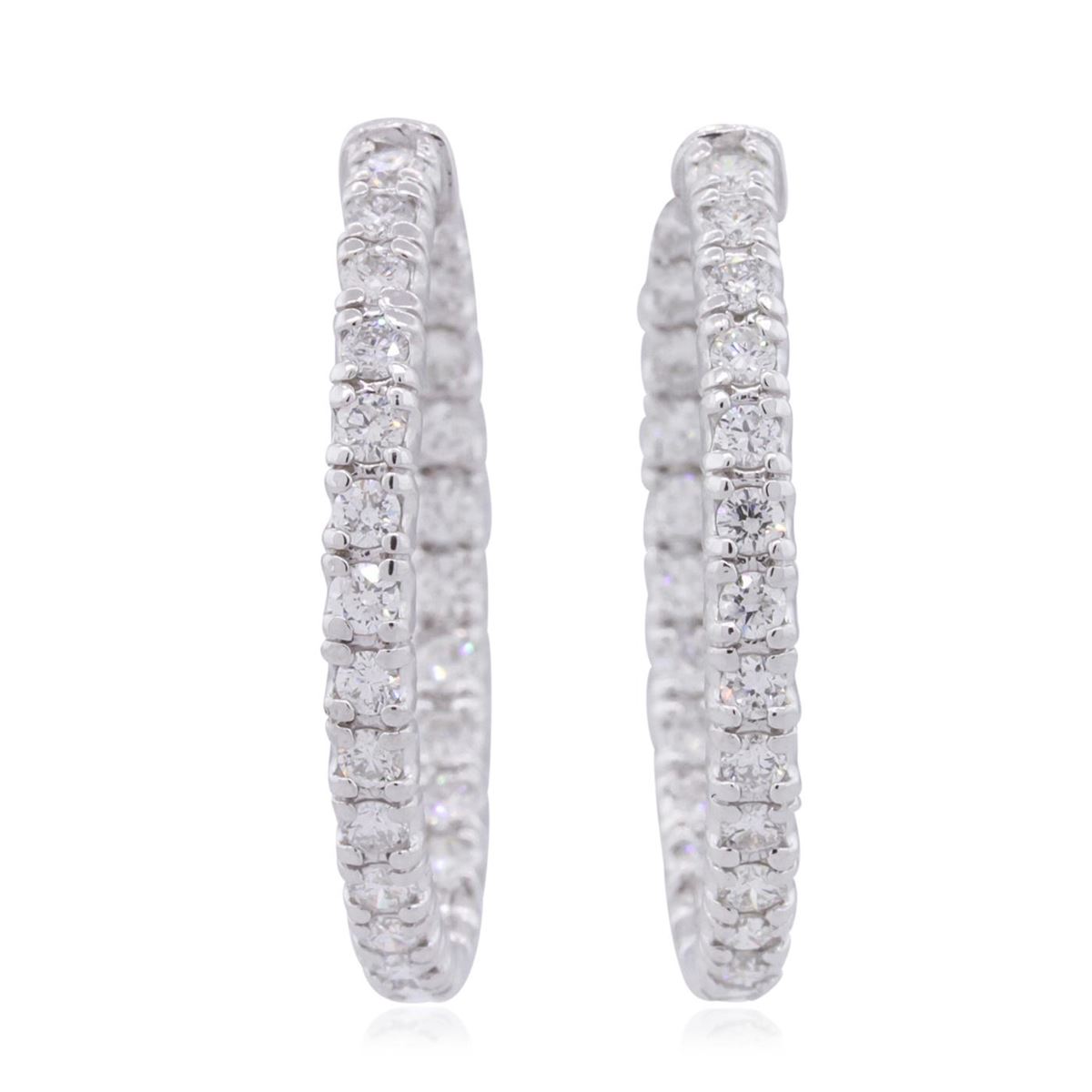 One pair electronically tested 14KT white gold ladies combination cast & assembled hoop earrings with hinged clip backs with a bright polish finish. Identified with markings of "14K". Condition is new. Containing: Fifty-Two prong set round brilliant cut diamonds, measuring 2.50 - 2.50 x 1.50mm (depth est.) approximate total weight of 52 Stones = 2.97ct. Clarity: SI-2 to I-1. Color: H - I, Cut is Good. All diamonds are graded in the mounting, unless otherwise stated. Total Weight of Diamonds 2.97ct. Total Weight of Earrings 12.20 grams. GGL Appraised at $8,635.00.