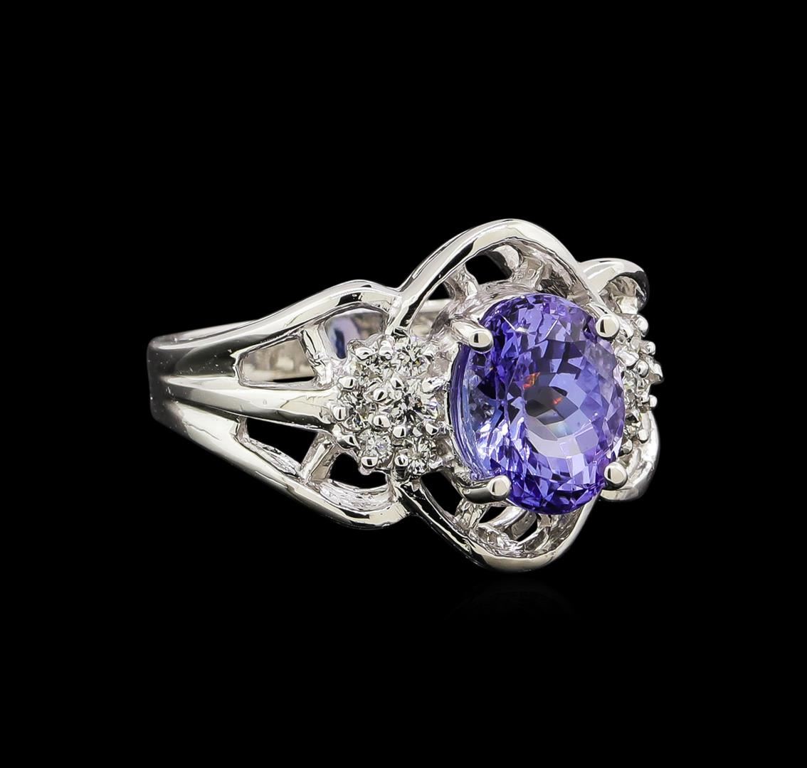 One electronically tested 14KT white gold ladies cast tanzanite and diamond ring with a bright polish finish. Identified with markings of "14K". Condition is new. Containing: One prong set oval modified brilliant cut natural tanzanite, measuring 9.30 x 7.30 x 4.75mm, approximate weight of 2.98ct., clarity is eye clean, type I, medium, moderately strong, violet color, (GIA V 5/4), cut is good. Twelve prong set round brilliant cut diamonds, measuring 2.50 - 1.50 x 1.20mm (depth est.) approximate total weight of 12 Stones = 0.32ct. Clarity: VS-2 to SI-1. Color: I - J, Cut is Good. Colored gemstones are presumed to have been subjected to commonly used enhancement processes. All diamonds and colored gemstones are graded in the mounting, unless otherwise stated. Total Weight of Colored Stones 2.98ct. Total Weight of Diamonds 0.32ct. Total Weight of Ring 7.20 grams. GGL Appraised at $3,890.00.