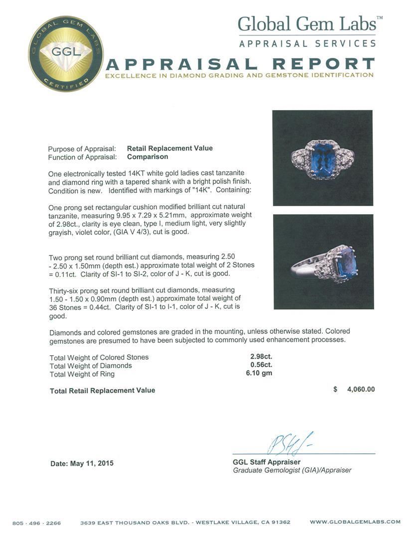 One electronically tested 14KT white gold ladies cast tanzanite and diamond ring with a tapered shank with a bright polish finish. Identified with markings of "14K". Condition is new. Containing: One prong set rectangular cushion modified brilliant cut natural tanzanite, measuring 9.95 x 7.29 x 5.21mm, approximate weight of 2.98ct., clarity is eye clean, type I, medium light, very slightly grayish, violet color, (GIA V 4/3), cut is good. Two prong set round brilliant cut diamonds, measuring 2.50 - 2.50 x 1.50mm (depth est.) approximate total weight of 2 Stones = 0.11ct. Clarity: SI-1 to SI-2. Color: J - K, Cut is Good. Thirty-Six prong set round brilliant cut diamonds, measuring 1.50 - 1.50 x 0.90mm (depth est.) approximate total weight of 36 Stones = 0.44ct. Clarity: SI-1 to I-1. Color: J - K, Cut is Good. Diamonds and colored gemstones are graded in the mounting, unless otherwise stated. Colored gemstones are presumed to have been subjected to commonly used enhancement processes. Total Weight of Colored Stones 2.98ct. Total Weight of Diamonds 0.56ct. Total Weight of Ring 6.10 grams. GGL Appraised.