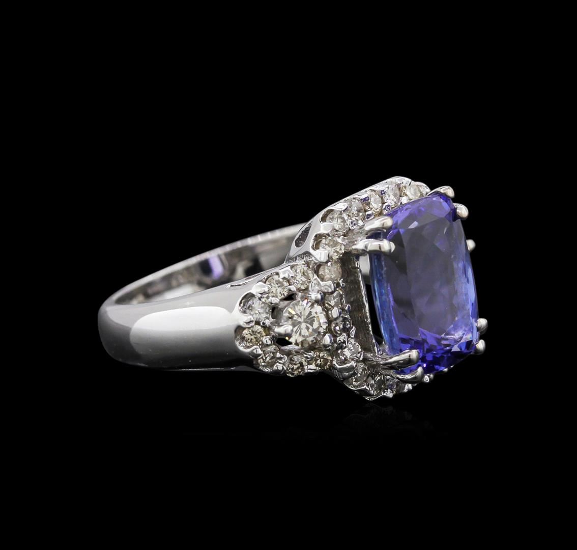 One electronically tested 14KT white gold ladies cast tanzanite and diamond ring with a tapered shank with a bright polish finish. Identified with markings of "14K". Condition is new. Containing: One prong set rectangular cushion modified brilliant cut natural tanzanite, measuring 9.95 x 7.29 x 5.21mm, approximate weight of 2.98ct., clarity is eye clean, type I, medium light, very slightly grayish, violet color, (GIA V 4/3), cut is good. Two prong set round brilliant cut diamonds, measuring 2.50 - 2.50 x 1.50mm (depth est.) approximate total weight of 2 Stones = 0.11ct. Clarity: SI-1 to SI-2. Color: J - K, Cut is Good. Thirty-Six prong set round brilliant cut diamonds, measuring 1.50 - 1.50 x 0.90mm (depth est.) approximate total weight of 36 Stones = 0.44ct. Clarity: SI-1 to I-1. Color: J - K, Cut is Good. Diamonds and colored gemstones are graded in the mounting, unless otherwise stated. Colored gemstones are presumed to have been subjected to commonly used enhancement processes. Total Weight of Colored Stones 2.98ct. Total Weight of Diamonds 0.56ct. Total Weight of Ring 6.10 grams. GGL Appraised at $4,060.00.