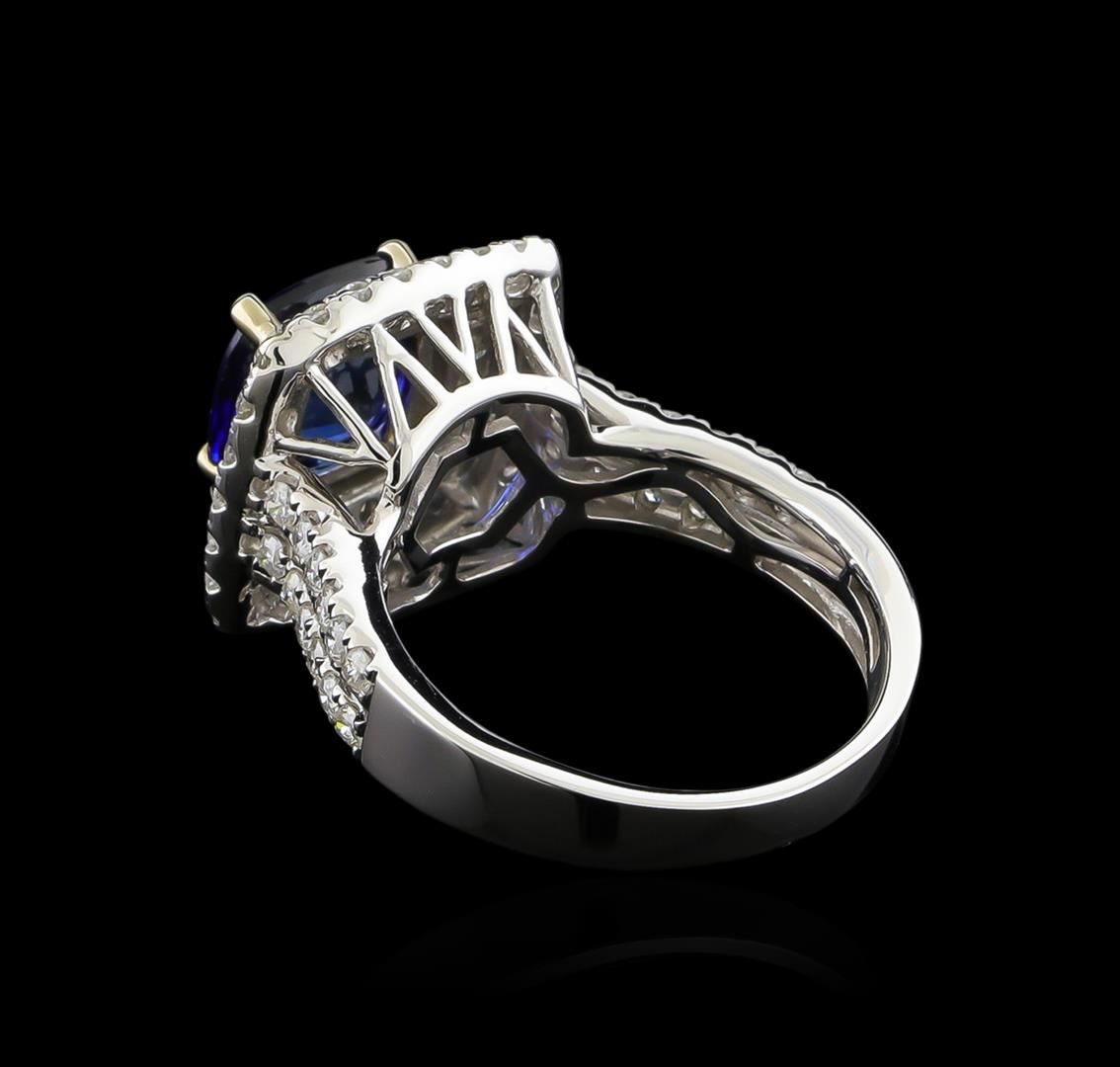 One electronically tested 14KT white gold ladies combination cast & assembled ring with a bright polish finish. Identified with markings of "14K". Condition is new. Containing: One prong set square cushion modified brilliant cut natural blue sapphire, measuring 7.88 x 7.88 x 5.12mm, approximate weight of 2.99ct., clarity is eye clean, type II, medium dark, moderately strong, blue color, (GIA B 6/4), cut is good. Sixty-Eight prong set round brilliant cut diamonds, measuring 1.60 - 1.60 x 0.96mm (depth est.) approximate total weight of 68 Stones = 1.01ct. Clarity: SI-2 to I-2. Color: I - J, Cut is Good. Colored gemstones are presumed to have been subjected to commonly used enhancement processes. All diamonds and colored gemstones are graded in the mounting, unless otherwise stated. Total Weight of Colored Stones 2.99ct. Total Weight of Diamonds 1.01ct. Total Weight of Ring 6.80 grams. GGL Appraised at $7,165.00.