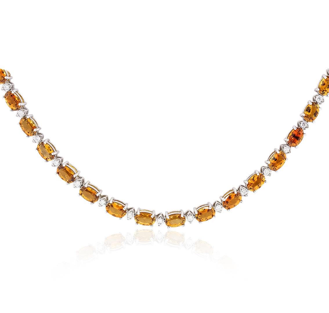 One electronically tested 14KT white gold ladies cast & assembled tourmaline & diamond necklace with a bright finish. The eighteen length necklace features a flexible tourmaline and diamond ribbon, terminating in a concealed clasp with safety. Identified with markings of "K14". Condition is good. Containing: Fifty-two prong set oval mixed cut natural golden tourmalines, measuring 6.00 x 4.00 x 2.50mm, approximate total weight of 20.00ct., clarity is slightly included, type II, dark, brownish, yellowish orange color, (GIA yO 7/1), cut is good. Refractive index testing results are conclusive for tourmaline. Transmitting light with no distortion, transparent. Naturally occurring internal & external characteristics are present. Measurements are an average for the group. Graded in the setting. Fifty-Two prong set round brilliant cut diamonds, measuring 1.80 - 1.80 x 1.10mm (depth est.) approximate total weight of 52 Stones = 1.12ct. Graded in the setting. Clarity I-1 to I-2. Color G -- H. Total Weight of Colored Stones 20.00ct. Total Weight of Diamonds 1.12ct. Total Weight of Necklace 22.08 grams. AIG Appraised at $13,880.00.