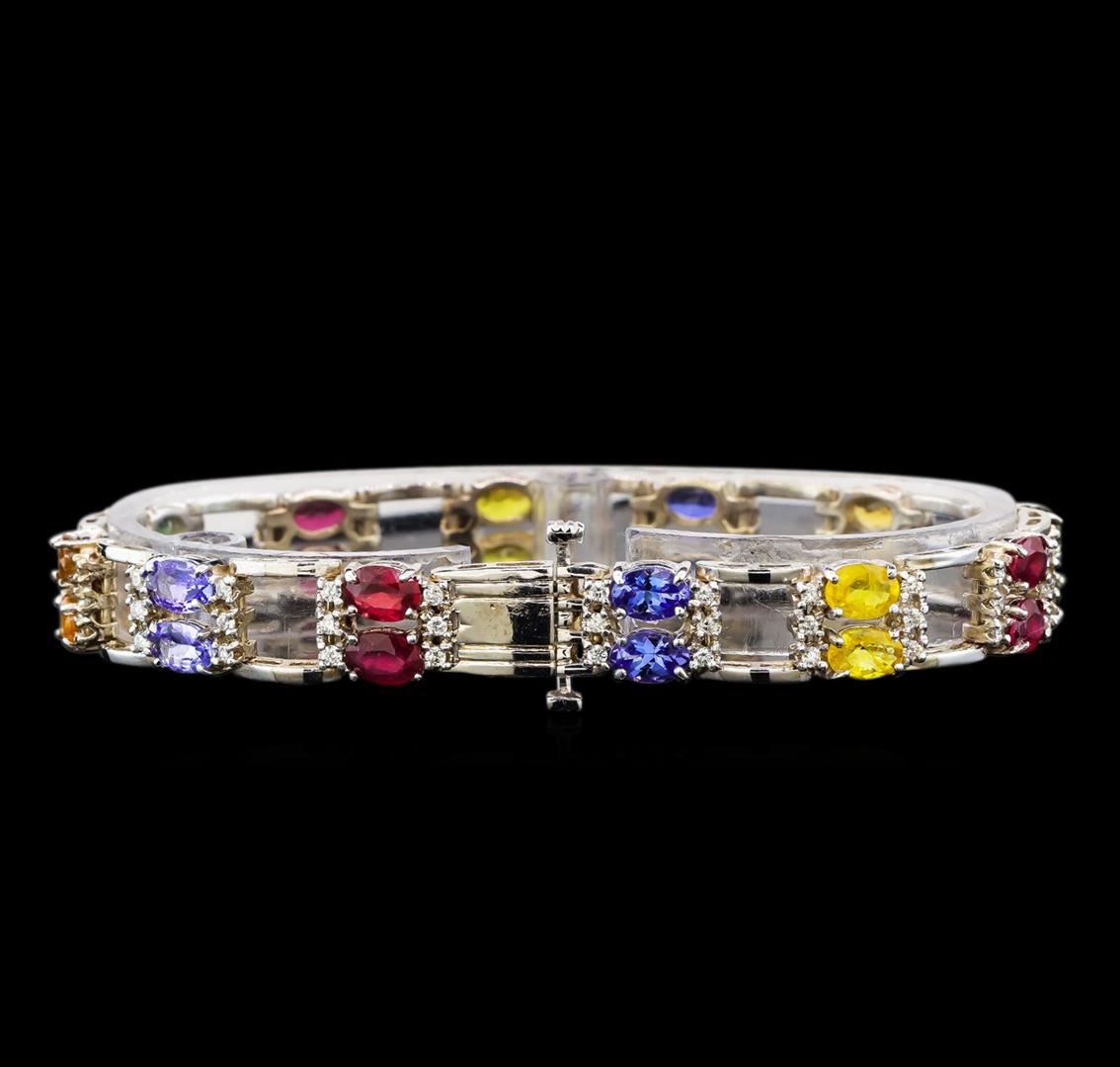 One electronically tested 14KT white gold ladies cast tanzanite, ruby, sapphire and diamond bracelet with a hidden box clasp with a bright polish finish. Measurements: 7 inches in length Condition is new. Containing: Four prong set oval modified brilliant cut natural tanzanites, measuring 6.00. x 4.00. x 2.60mm, approximate total weight of 3.50ct., clarity is eye clean, type I, medium light, very slightly grayish, violet color, (GIA V 4/3), cut is good. Six prong set oval modified brilliant cut natural rubies, measuring 6.00. x 4.00. x 2.60mm, approximate total weight of 4.74ct., clarity is heavily included, type II, medium, moderately strong, red color, (GIA R 5/4), cut is good. Four prong set oval modified brilliant cut natural orange sapphires, measuring 6.00. x 4.00. x 2.60mm, approximate total weight of 3.50ct., clarity is slightly included, type II, medium light, brownish, orange color, (GIA O 4/3), cut is good. Four prong set oval modified brilliant cut natural green sapphires, measuring 6.00. x 4.00. x 2.60mm, approximate total weight of 3.50ct., clarity is moderately included, medium, very slightly grayish, bluish green color, (GIA bG 5/3), cut is good. Four prong set oval modified brilliant cut natural yellow sapphires, measuring 6.00. x 4.00. x 2.60mm, approximate total weight of 3.80ct., clarity is moderately included, type II, medium light, yellow color, (GIA Y 4/0), cut is good. Two prong set oval modified brilliant cut natural blue sapphires, measuring 6.00. x 4.00. x 2.60mm, approximate total weight of 1.00.ct., clarity is slightly included, type II, medium light, very slightly grayish, blue color, (GIA B 4/3), cut is good. Seventy-Two prong set round brilliant cut diamonds, measuring 1.50 - 1.50 x 0.90mm (depth est.) approximate total weight of 72 Stones = 1.10ct. Clarity: SI-2 to I-1. Color: I - J, Cut is Good. Colored gemstones are presumed to have been subjected to commonly used enhancement processes. All diamonds and colored gemstones are graded in the mounting, unless otherwise stated. Total Weight of Colored Stones 20.04ct. Total Weight of Diamonds 1.10ct. Total Weight of Bracelet 24.60 grams. GGL Appraised at $7,345.00.