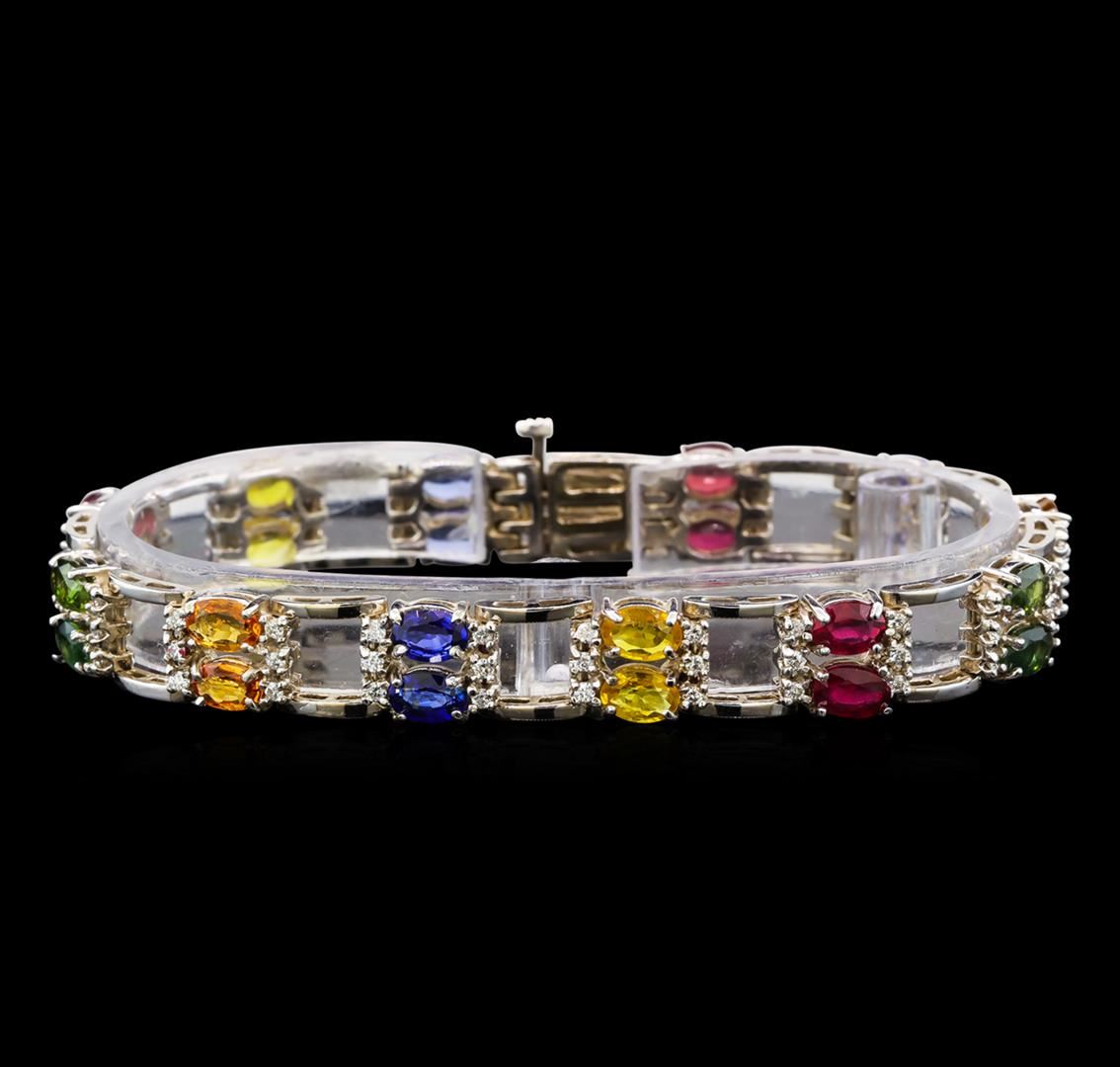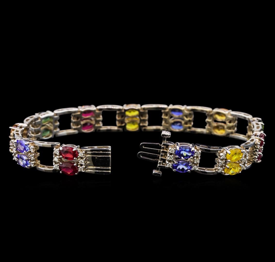 One electronically tested 14KT white gold ladies cast tanzanite, ruby, sapphire and diamond bracelet with a hidden box clasp with a bright polish finish. Measurements: 7 inches in length Condition is new. Containing: Four prong set oval modified brilliant cut natural tanzanites, measuring 6.00. x 4.00. x 2.60mm, approximate total weight of 3.50ct., clarity is eye clean, type I, medium light, very slightly grayish, violet color, (GIA V 4/3), cut is good. Six prong set oval modified brilliant cut natural rubies, measuring 6.00. x 4.00. x 2.60mm, approximate total weight of 4.74ct., clarity is heavily included, type II, medium, moderately strong, red color, (GIA R 5/4), cut is good. Four prong set oval modified brilliant cut natural orange sapphires, measuring 6.00. x 4.00. x 2.60mm, approximate total weight of 3.50ct., clarity is slightly included, type II, medium light, brownish, orange color, (GIA O 4/3), cut is good. Four prong set oval modified brilliant cut natural green sapphires, measuring 6.00. x 4.00. x 2.60mm, approximate total weight of 3.50ct., clarity is moderately included, medium, very slightly grayish, bluish green color, (GIA bG 5/3), cut is good. Four prong set oval modified brilliant cut natural yellow sapphires, measuring 6.00. x 4.00. x 2.60mm, approximate total weight of 3.80ct., clarity is moderately included, type II, medium light, yellow color, (GIA Y 4/0), cut is good. Two prong set oval modified brilliant cut natural blue sapphires, measuring 6.00. x 4.00. x 2.60mm, approximate total weight of 1.00.ct., clarity is slightly included, type II, medium light, very slightly grayish, blue color, (GIA B 4/3), cut is good. Seventy-Two prong set round brilliant cut diamonds, measuring 1.50 - 1.50 x 0.90mm (depth est.) approximate total weight of 72 Stones = 1.10ct. Clarity: SI-2 to I-1. Color: I - J, Cut is Good. Colored gemstones are presumed to have been subjected to commonly used enhancement processes. All diamonds and colored gemstones are graded in the mounting, unless otherwise stated. Total Weight of Colored Stones 20.04ct. Total Weight of Diamonds 1.10ct. Total Weight of Bracelet 24.60 grams. GGL Appraised at $7,345.00.