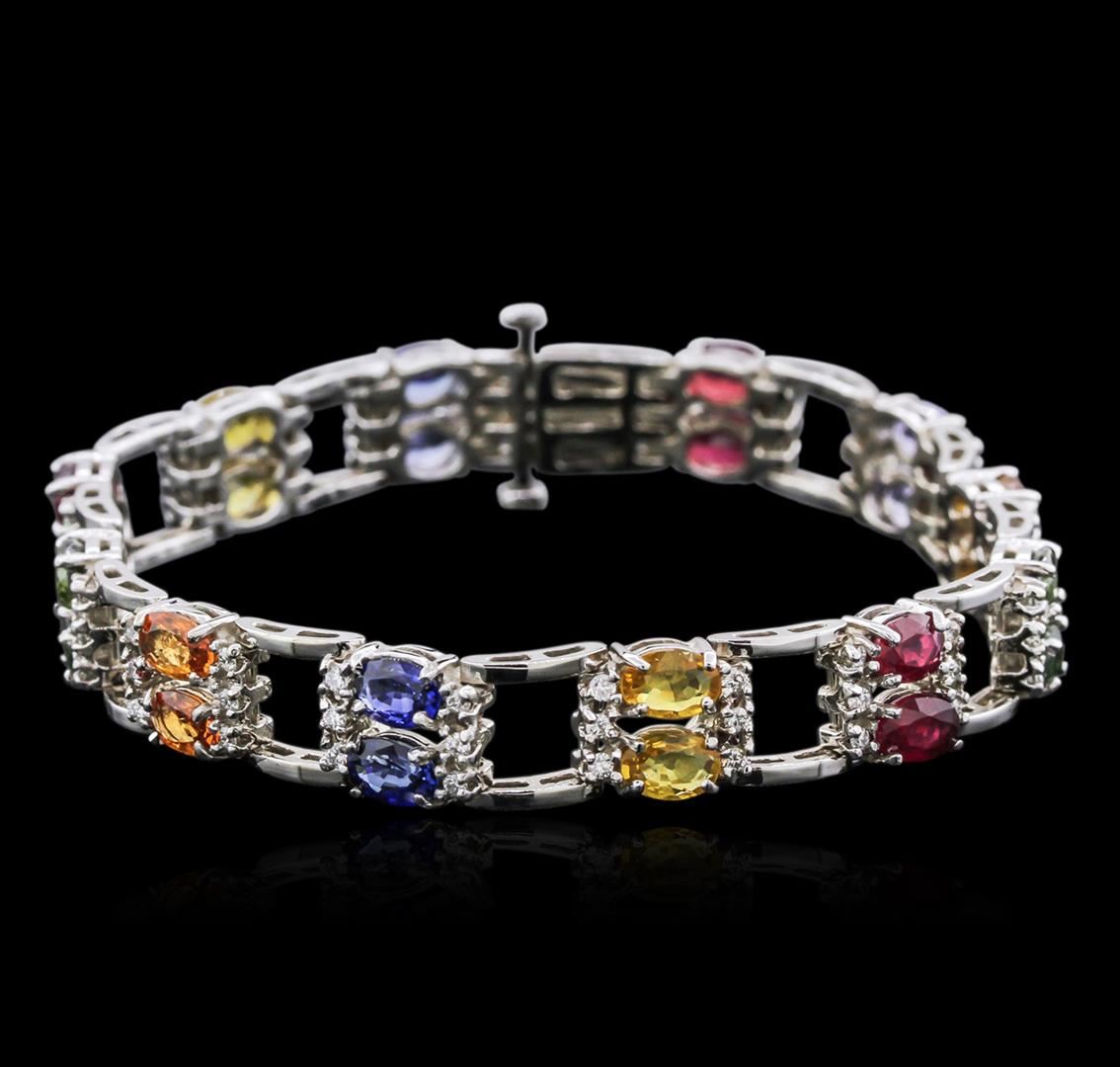 One electronically tested 14KT white gold ladies cast tanzanite, ruby, sapphire and diamond bracelet with a hidden box clasp with a bright polish finish. Measurements: 7 inches in length Condition is new. Containing: Four prong set oval modified brilliant cut natural tanzanites, measuring 6.00. x 4.00. x 2.60mm, approximate total weight of 3.50ct., clarity is eye clean, type I, medium light, very slightly grayish, violet color, (GIA V 4/3), cut is good. Six prong set oval modified brilliant cut natural rubies, measuring 6.00. x 4.00. x 2.60mm, approximate total weight of 4.74ct., clarity is heavily included, type II, medium, moderately strong, red color, (GIA R 5/4), cut is good. Four prong set oval modified brilliant cut natural orange sapphires, measuring 6.00. x 4.00. x 2.60mm, approximate total weight of 3.50ct., clarity is slightly included, type II, medium light, brownish, orange color, (GIA O 4/3), cut is good. Four prong set oval modified brilliant cut natural green sapphires, measuring 6.00. x 4.00. x 2.60mm, approximate total weight of 3.50ct., clarity is moderately included, medium, very slightly grayish, bluish green color, (GIA bG 5/3), cut is good. Four prong set oval modified brilliant cut natural yellow sapphires, measuring 6.00. x 4.00. x 2.60mm, approximate total weight of 3.80ct., clarity is moderately included, type II, medium light, yellow color, (GIA Y 4/0), cut is good. Two prong set oval modified brilliant cut natural blue sapphires, measuring 6.00. x 4.00. x 2.60mm, approximate total weight of 1.00.ct., clarity is slightly included, type II, medium light, very slightly grayish, blue color, (GIA B 4/3), cut is good. Seventy-Two prong set round brilliant cut diamonds, measuring 1.50 - 1.50 x 0.90mm (depth est.) approximate total weight of 72 Stones = 1.10ct. Clarity: SI-2 to I-1. Color: I - J, Cut is Good. Colored gemstones are presumed to have been subjected to commonly used enhancement processes. All diamonds and colored gemstones are graded in the mounting, unless otherwise stated. Total Weight of Colored Stones 20.04ct. Total Weight of Diamonds 1.10ct. Total Weight of Bracelet 24.60 grams. GGL Appraised at $7,345.00.