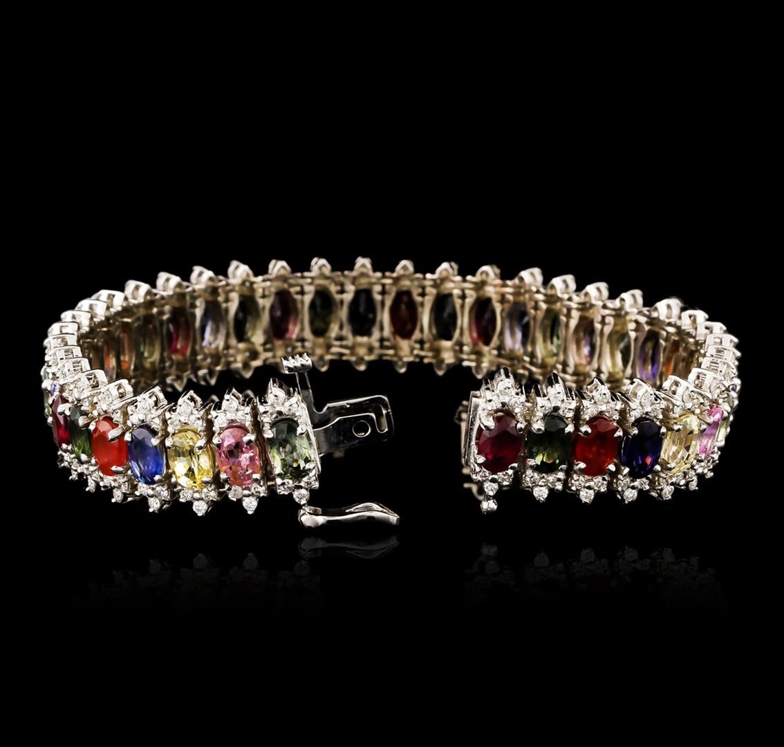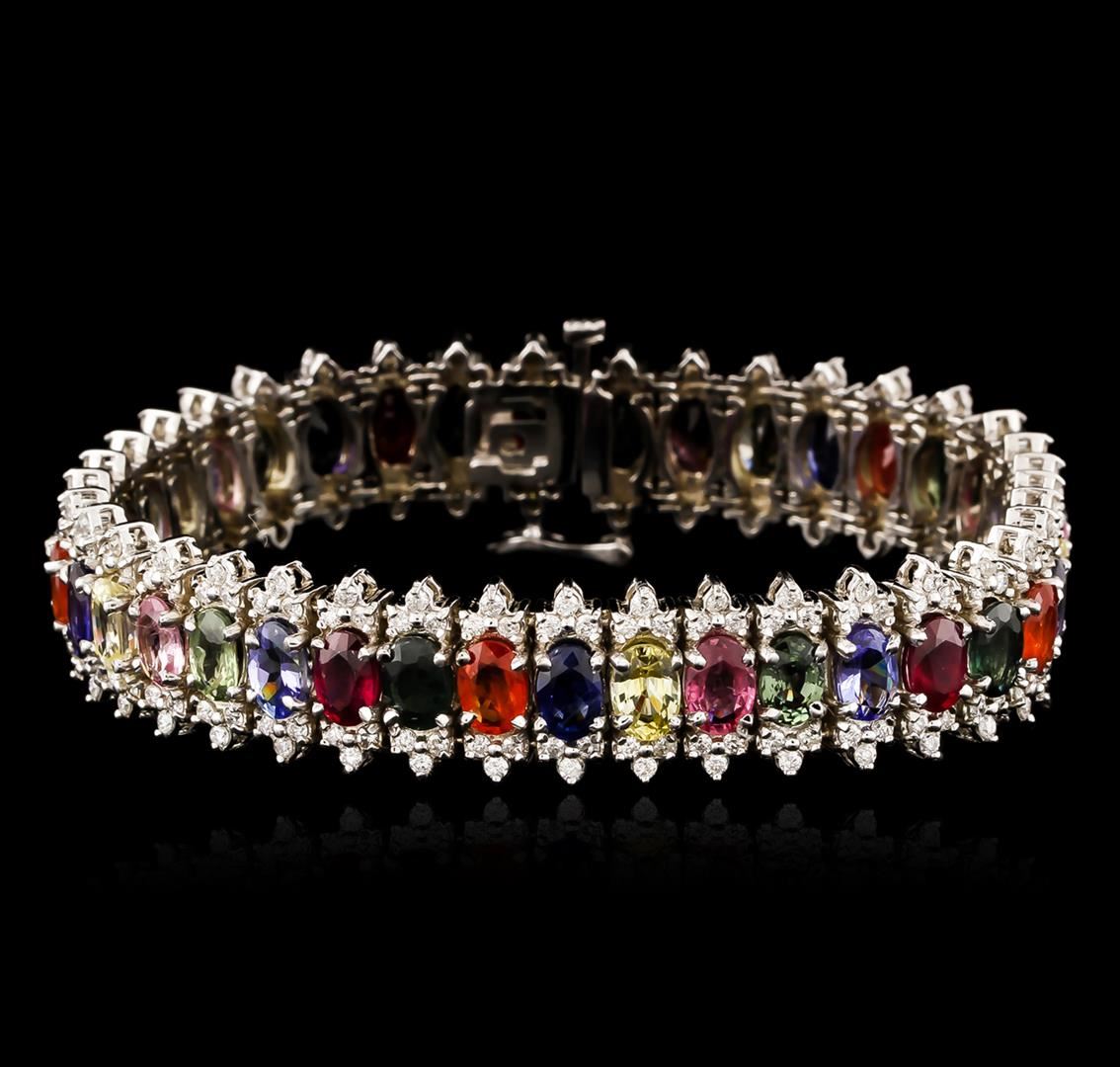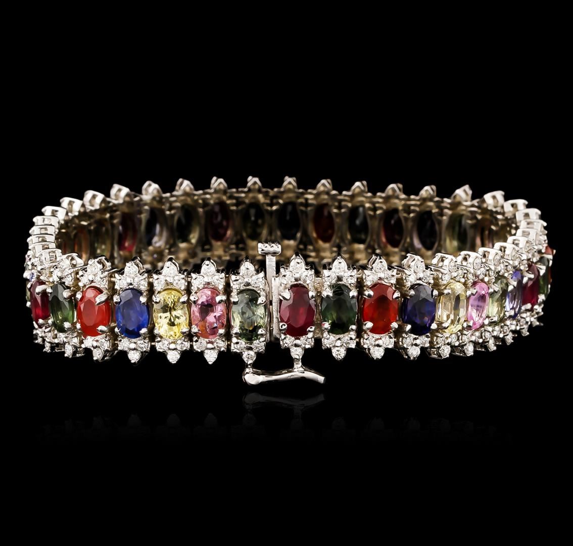 One electronically tested 14KT white gold ladies cast sapphire, ruby, tanzanite and diamond bracelet with a hidden box clasp with safety closer with a bright polish finish. Measurements: 6.75" in length. Condition is new. Containing: Thirty-two prong set oval modified brilliant cut natural purple sapphires, measuring 6.00. x 4.00. x 2.60mm, approximate total weight of 16.64ct., clarity is slightly included, type II, medium light, very slightly grayish, purple red color, (GIA PR 4/3), cut is good. Four prong set oval modified brilliant cut natural rubies, measuring 6.00. x 4.00. x 2.60mm, approximate total weight of 2.12ct., clarity is moderately included, medium, moderately strong, strongly purplish red color, (GIA stpR 5/4), cut is good. Three prong set oval modified brilliant cut natural tanzanites, measuring 6.00. x 4.00. x 2.60mm, approximate total weight of 1.32ct., clarity is eye clean, type I, medium light, very slightly grayish, violet color, (GIA V 4/3), cut is good. Two Hundred Thirty-Four prong set round brilliant cut diamonds, measuring 1.30 - 1.30 x 0.78mm (depth est.) approximate total weight of 234 Stones = 1.87ct. Clarity: I-1 to I-2. Color: H - I. Colored gemstones are presumed to have been subjected to commonly used enhancement processes. All diamonds and colored gemstones are graded in the mounting, unless otherwise stated. Total Weight of Colored Stones 20.08ct. Total Weight of Diamonds 1.87ct. Total Weight of Bracelet 35.00 grams. GGL Appraised at $13,095.00.