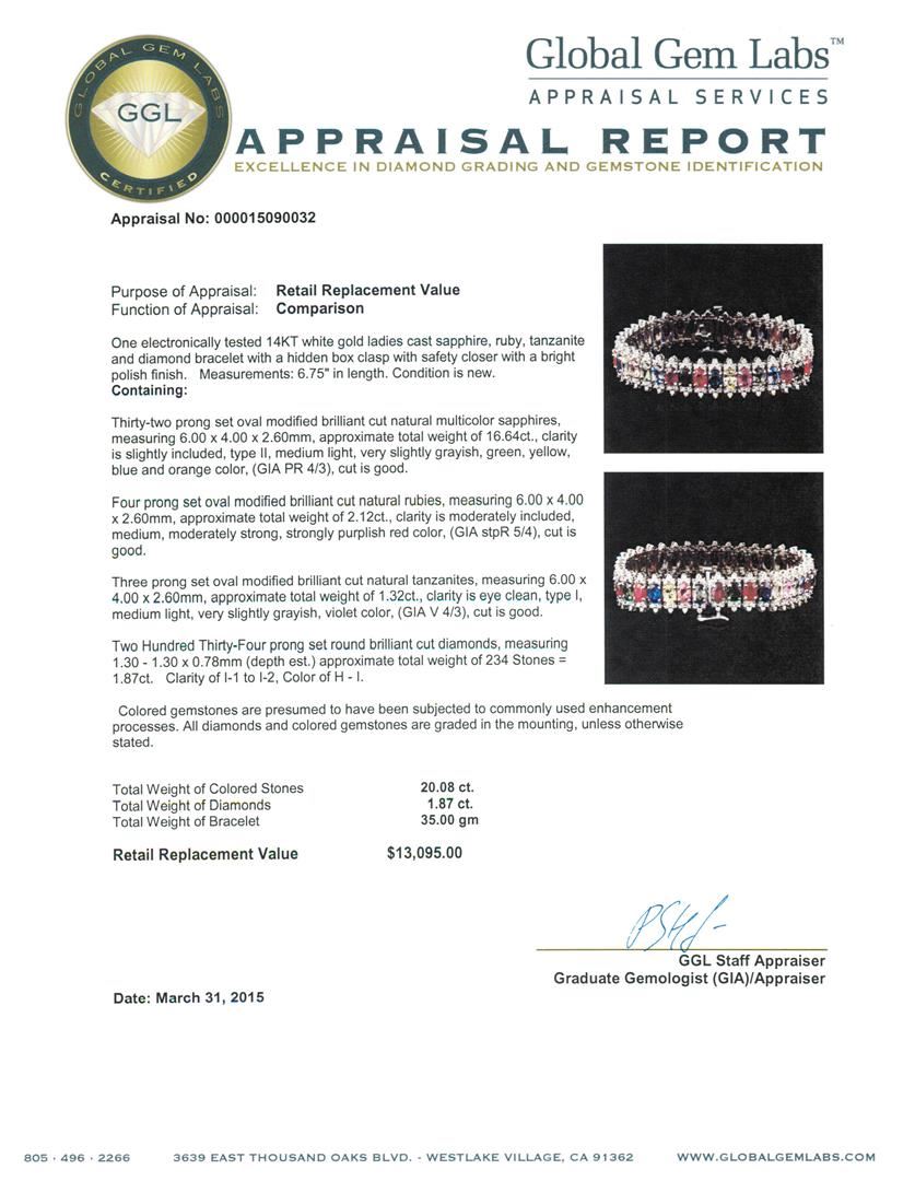 One electronically tested 14KT white gold ladies cast sapphire, ruby, tanzanite and diamond bracelet with a hidden box clasp with safety closer with a bright polish finish. Measurements: 6.75" in length. Condition is new. Containing: Thirty-two prong set oval modified brilliant cut natural purple sapphires, measuring 6.00. x 4.00. x 2.60mm, approximate total weight of 16.64ct., clarity is slightly included, type II, medium light, very slightly grayish, purple red color, (GIA PR 4/3), cut is good. Four prong set oval modified brilliant cut natural rubies, measuring 6.00. x 4.00. x 2.60mm, approximate total weight of 2.12ct., clarity is moderately included, medium, moderately strong, strongly purplish red color, (GIA stpR 5/4), cut is good. Three prong set oval modified brilliant cut natural tanzanites, measuring 6.00. x 4.00. x 2.60mm, approximate total weight of 1.32ct., clarity is eye clean, type I, medium light, very slightly grayish, violet color, (GIA V 4/3), cut is good. Two Hundred Thirty-Four prong set round brilliant cut diamonds, measuring 1.30 - 1.30 x 0.78mm (depth est.) approximate total weight of 234 Stones = 1.87ct. Clarity: I-1 to I-2. Color: H - I. Colored gemstones are presumed to have been subjected to commonly used enhancement processes. All diamonds and colored gemstones are graded in the mounting, unless otherwise stated. Total Weight of Colored Stones 20.08ct. Total Weight of Diamonds 1.87ct. Total Weight of Bracelet 35.00 grams. GGL Appraised at $13,095.00.
