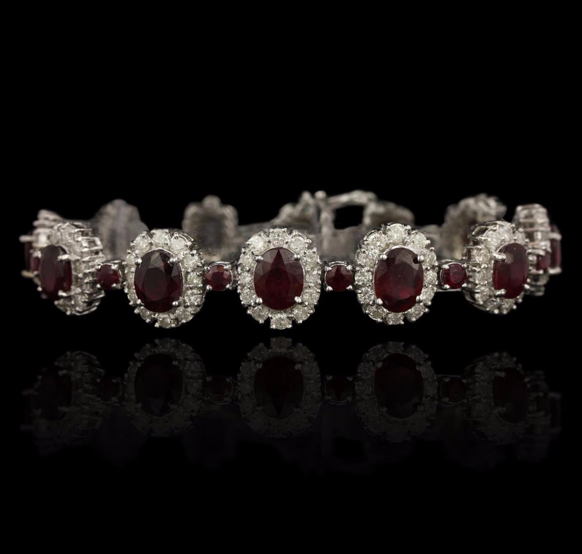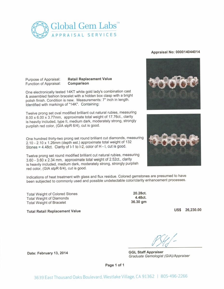 One electronically tested 14KT White Gold Ladies combination cast & assembled fashion bracelet with a hidden box clasp with a bright polish finish. Condition is new. Measurements: 7" inch in length. Identified with markings of "14K". Containing: Twelve prong set oval modified brilliant cut natural rubies, measuring 8.00 x 6.00 x 3.77mm, approximate total weight of 17.76ct., clarity is heavily included, type II, medium dark, moderately strong, strongly purplish red color, (GIA stpR 6/4), cut is good. One Hundred Thirty-Two prong set round brilliant cut diamonds, measuring 2.10 - 2.10 x 1.26mm (depth est.) approximate total weight of 132 Stones = 4.48ct. Clarity of I-1 to I-2, Color of H - I, Cut is Good. Twelve prong set round modified brilliant cut natural rubies, measuring 3.60 - 3.60 x 2.34 mm, approximate total weight of 2.52ct., clarity is heavily included, medium dark, moderately strong, strongly purplish red color, (GIA stpR 6/4), cut is good. Indications of heat treatment with glass and flux residue. Colored gemstones are presumed to have been subjected to commonly used and possible undetectable color/clarity enhancement processes. Total Weight of Colored Stones 20.28ct. Total Weight of Diamonds 4.48ct. Total Weight of Bracelet 36.30gm. GGL Appraised at $26,230.00.