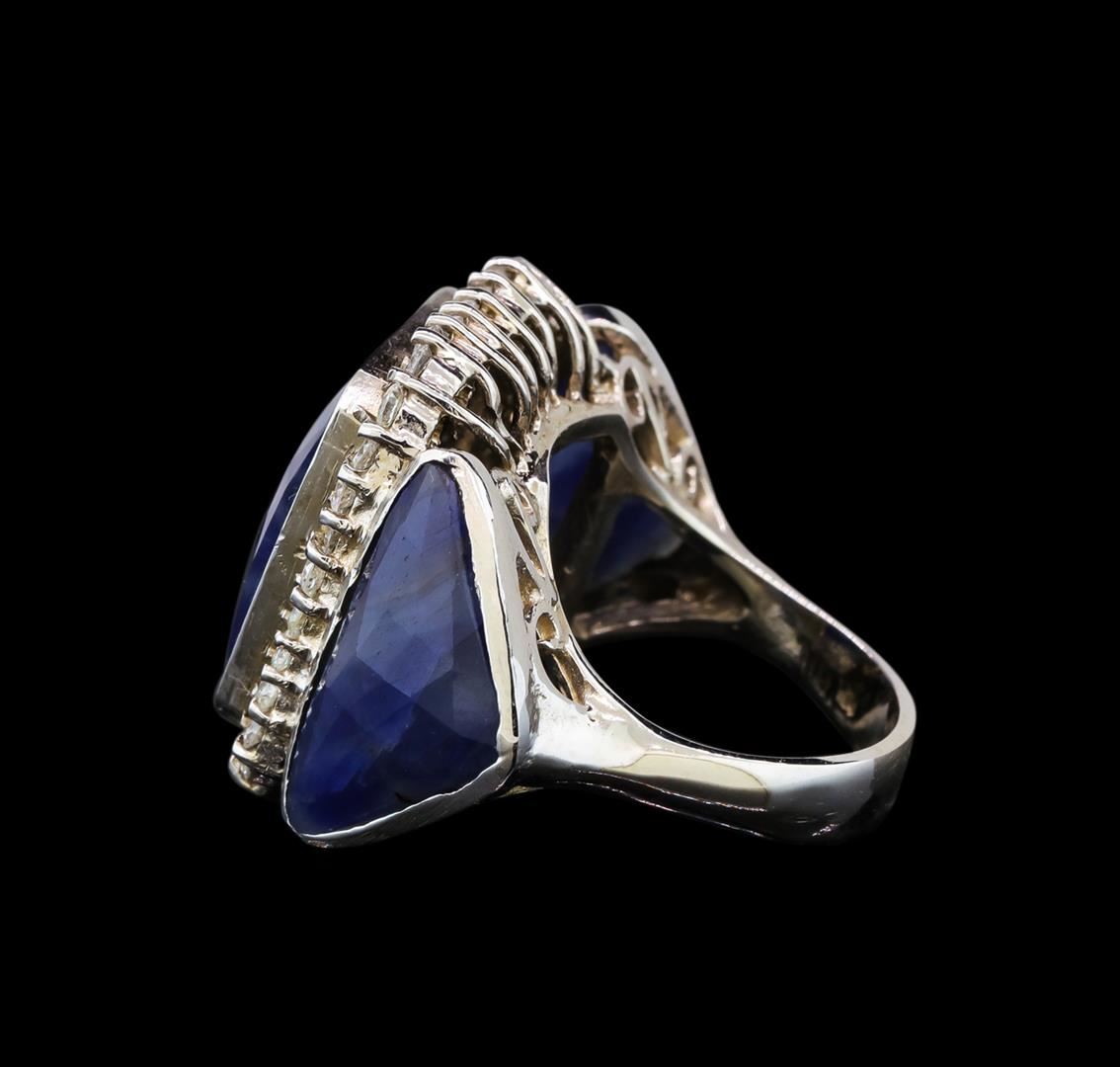 One electronically tested 14KT white gold ladies custom hand made sapphire and diamond ring with a bright polish finish. Identified with markings of "k14". Condition is very good. Containing: One bezel set rectangular modified mixed cut natural blue sapphire, measuring 16.00 x 11.50 x 4.00mm, approximate weight of 8.83ct., clarity is severely included, type II, medium dark, strong, blue color, (GIA B 6/5)Two bezel set triangle modified mixed cut natural blue sapphires, measuring 17.00 x 12.00 x 4.00mm, approximate total weight of 11.76ct., clarity is severely included, type II, medium dark, moderately strong, blue color, (GIA B 6/4)Thirty-Four prong set round brilliant cut diamonds, measuring 2.00 - 2.00 x 1.20mm (depth est.) approximate total weight of 34 Stones = 1.00 ct. Clarity: I-1 to I-3. Color: I - J. Colored gemstones are presumed to have been subjected to commonly used enhancement processes. All diamonds and colored gemstones are graded in the mounting, unless otherwise stated. Total Weight of Colored Stones 20.59ct. Total Weight of Diamonds 1.00 ct. Total Weight of Ring 17.30 grams. GGL Appraised.