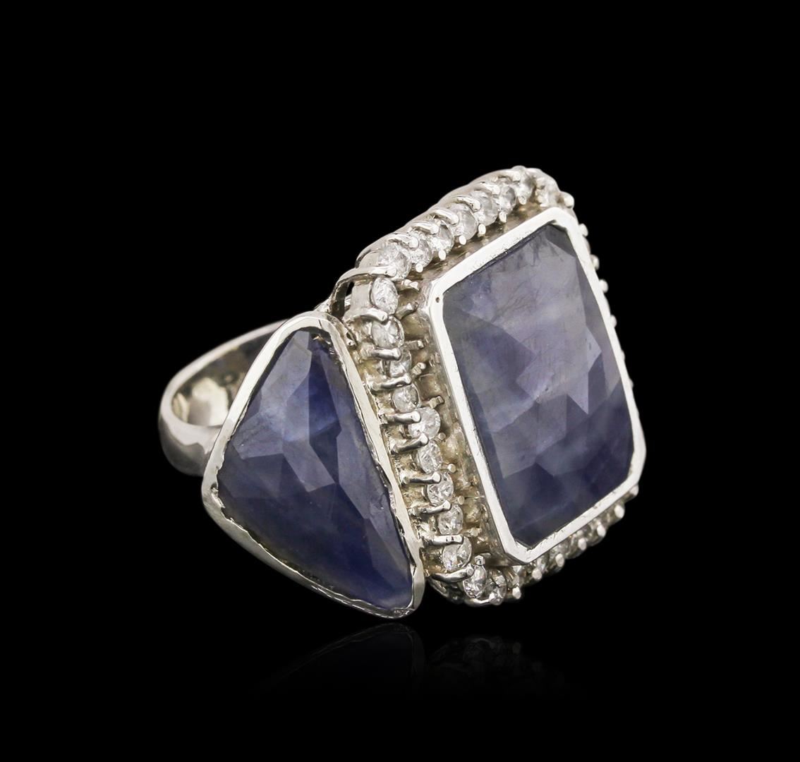 One electronically tested 14KT white gold ladies custom hand made sapphire and diamond ring with a bright polish finish. Identified with markings of "k14". Condition is very good. Containing: One bezel set rectangular modified mixed cut natural blue sapphire, measuring 16.00 x 11.50 x 4.00mm, approximate weight of 8.83ct., clarity is severely included, type II, medium dark, strong, blue color, (GIA B 6/5)Two bezel set triangle modified mixed cut natural blue sapphires, measuring 17.00 x 12.00 x 4.00mm, approximate total weight of 11.76ct., clarity is severely included, type II, medium dark, moderately strong, blue color, (GIA B 6/4)Thirty-Four prong set round brilliant cut diamonds, measuring 2.00 - 2.00 x 1.20mm (depth est.) approximate total weight of 34 Stones = 1.00ct. Clarity: I-1 to I-3. Color: I - J. Colored gemstones are presumed to have been subjected to commonly used enhancement processes. All diamonds and colored gemstones are graded in the mounting, unless otherwise stated. Total Weight of Colored Stones 20.59ct. Total Weight of Diamonds 1.00ct. Total Weight of Ring 17.30 grams. GGL Appraised at $3,250.00.