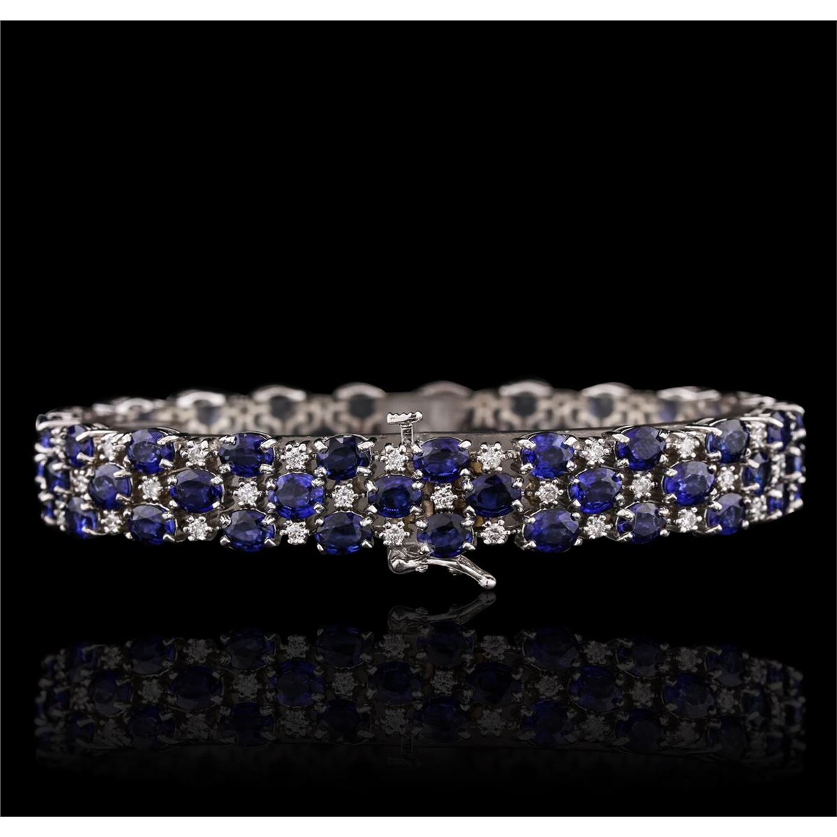 One electronically tested 14KT white gold ladies combination cast & assembled bracelet with a hidden box clasp with a bright polish finish. Measurements: 7" in length Identified with markings of "14K". Condition is new. Containing: Sixty-three prong set oval modified brilliant cut natural blue sapphires, measuring 5.00 x 3.50 x 2.28mm, approximate total weight of 20.79ct., clarity is eye clean, type II, medium, moderately strong, blue color, (GIA B 5/4), cut is good. Sixty-Three prong set round brilliant cut diamonds, measuring 1.50 - 1.50 x 0.90mm (depth est.) approximate total weight of 63 Stones = 0.78ct. Clarity: SI-1 to SI-2. Color: I - J, Cut is Good. Colored gemstones are presumed to have been subjected to commonly used enhancement processes. All diamonds and colored gemstones are graded in the mounting, unless otherwise stated. Total Weight of Colored Stones 20.79ct. Total Weight of Diamonds 0.78ct. Total Weight of Bracelet 32.20 grams. GGL Appraised at $21,025.00.