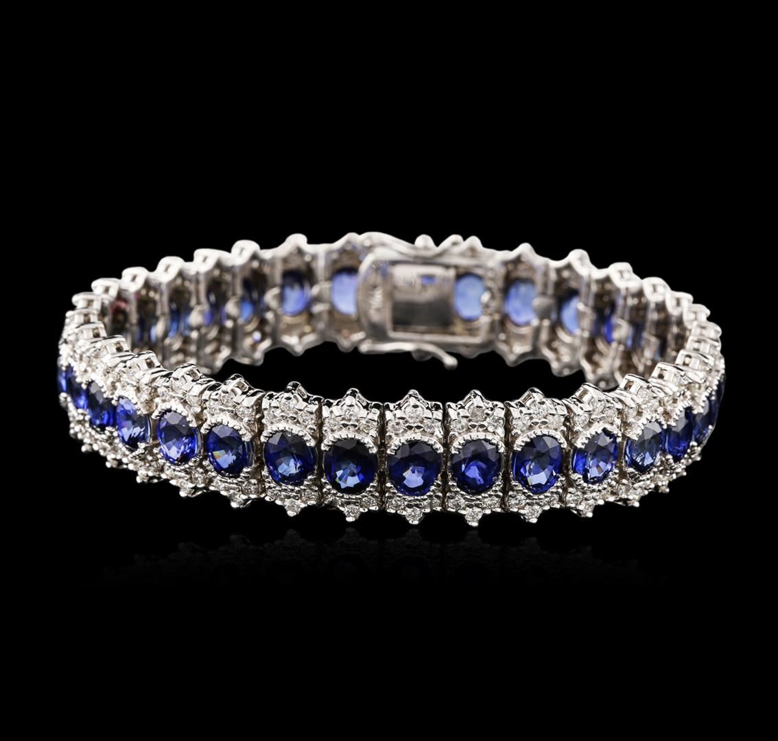 One electronically tested 14KT white gold ladies cast & assembled sapphire and diamond bracelet. Seven and one-quarter inch length bracelet features a flexible one-half inch wide sapphire ribbon set within stylized mirroring diamond ribbons, terminating in a concealed clasp with twin safeties. Bright polish finish with milgrain detailing. Identified with markings of "14K". Condition is new, good workmanship. Containing: Thirty-three prong set oval mixed cut natural blue sapphires, measuring 5.80 x 4.70 x 2.70mm, 6% bulge factor, approximate total weight of 20.79ct., clarity is moderately included, type II, dark, moderately strong, blue color, (GIA B 7/4), cut is good. Transmitting light with a minimum of distortion, transparent. Naturally occurring internal & external characteristics are present. Measurements & the color grade are an average for the group. Indications of laboratory high temperature diffusion treatment. Graded in the setting. One Hundred Ninety-Eight prong set round brilliant cut diamonds, measuring 1.70 - 1.60 x 0.99mm (depth est.) approximate total weight of 198 Stones = 3.34ct. Graded in the setting. Clarity: SI-1 to I-1. Color: G - I. Total Weight of Colored Stones 20.79ct. Total Weight of Diamonds 3.34ct. Total Weight of Bracelet 37.00 grams. AIG Appraised at $19,940.00.