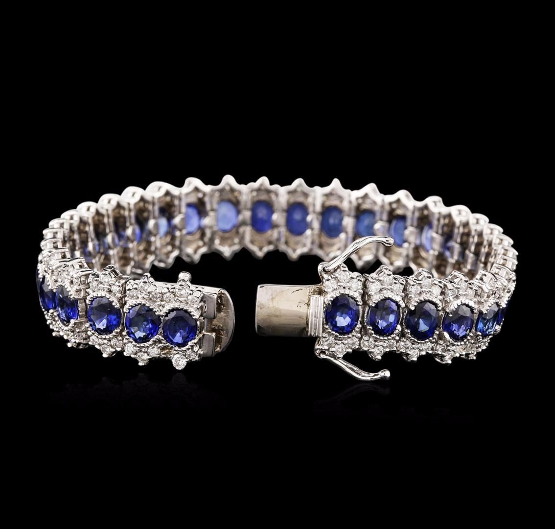 One electronically tested 14KT white gold ladies cast & assembled sapphire and diamond bracelet. Seven and one-quarter inch length bracelet features a flexible one-half inch wide sapphire ribbon set within stylized mirroring diamond ribbons, terminating in a concealed clasp with twin safeties. Bright polish finish with milgrain detailing. Identified with markings of "14K". Condition is new, good workmanship. Containing: Thirty-three prong set oval mixed cut natural blue sapphires, measuring 5.80 x 4.70 x 2.70mm, 6% bulge factor, approximate total weight of 20.79ct., clarity is moderately included, type II, dark, moderately strong, blue color, (GIA B 7/4), cut is good. Transmitting light with a minimum of distortion, transparent. Naturally occurring internal & external characteristics are present. Measurements & the color grade are an average for the group. Indications of laboratory high temperature diffusion treatment. Graded in the setting. One Hundred Ninety-Eight prong set round brilliant cut diamonds, measuring 1.70 - 1.60 x 0.99mm (depth est.) approximate total weight of 198 Stones = 3.34ct. Graded in the setting. Clarity: SI-1 to I-1. Color: G - I. Total Weight of Colored Stones 20.79ct. Total Weight of Diamonds 3.34ct. Total Weight of Bracelet 37.00 grams. AIG Appraised at $19,940.00.