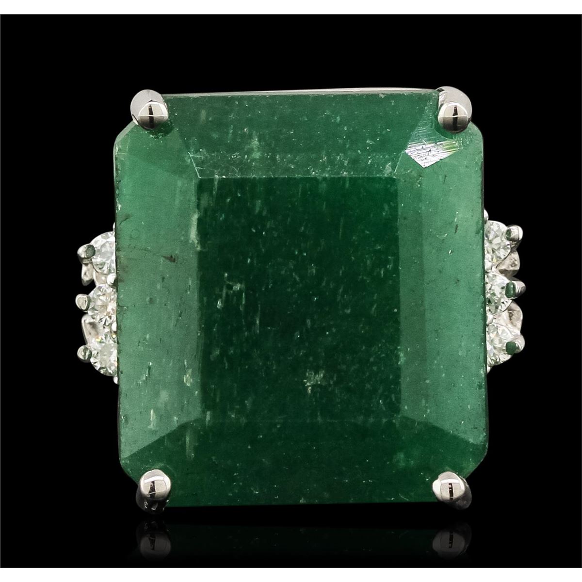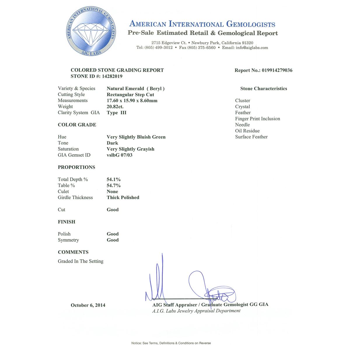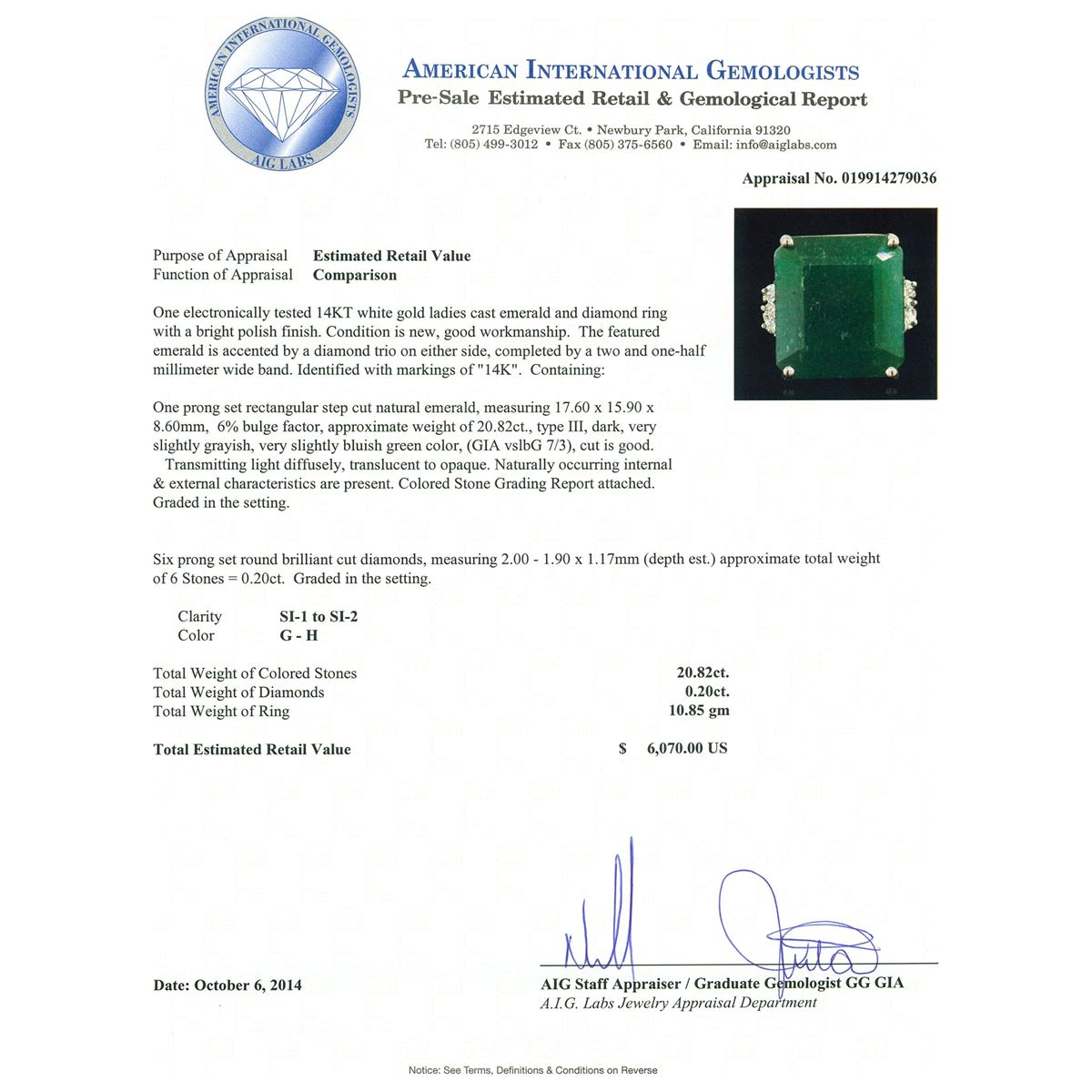 One electronically tested 14KT white gold ladies cast emerald and diamond ring with a bright polish finish. The featured emerald is accented by a diamond trio on either side, completed by a two and one-half millimeter wide band. Identified with markings of "14K". Condition is new, good workmanship. Containing: One prong set rectangular step cut natural emerald, measuring 17.60 x 15.90 x 8.60mm, 6%. bulge factor, approximate weight of 20.82ct., type III, dark, very slightly grayish, very slightly bluish green color, (GIA vslbG 7/3), cut is good. Transmitting light diffusely, translucent to opaque. Naturally occurring internal & external characteristics are present. Colored Stone Grading Report attached. Graded in the setting. Six prong set round brilliant cut diamonds, measuring 2.00 - 1.90 x 1.17mm (depth est.) approximate. Total Weight of 6 Stones = 0.20ct. Graded in the setting. Clarity: SI-1 to SI-2. Color: G - H. Total Weight of Colored Stones 20.82ct. Total Weight of Diamonds 0.20ct. Total Weight of Ring 10.85gm. AIG Appraised at $6,070.00.