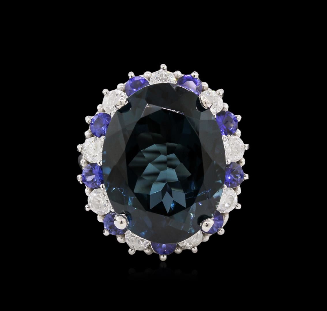 One electronically tested 14KT white gold ladies cast blue topaz, sapphire and diamond ring with a bright polish finish. The featured blue topaz is set within a sapphire and diamond bezel, completed by a two and one-half millimeter wide band. Identified with markings of "K14". Condition is new, good workmanship. Containing: One prong set oval mixed cut natural blue topaz, measuring 19.50 x 15.00 x 9.35mm, 6% bulge factor, approximate weight of 20.82ct., clarity is eye clean, type I, dark, very slightly grayish, very slightly greenish blue color, (GIA vslgB 7/3), cut is good. Transmitting light with no distortion, transparent. Graded in the setting. A deposit of a thin layer has been applied to the topaz to produce the intense color effect. The process utilizes a very high temperature treatment, diffusion of ions into the topaz, plus in some cases neutron bombardment has been used to create the color center. Diffusion processes causes the added ions to become part of the crystal surface with no distinct boundary. Do not put a gem treated in this manner into an ultrasonic cleaner. Nine prong set round brilliant cut natural blue sapphires, measuring 3.10 - 3.00 x 1.98 mm, approximate total weight of 1.35ct., clarity is slightly included, type II, dark, moderately strong, blue color, (GIA B 7/4), cut is good. Transmitting light with a minimum of distortion, transparent. Naturally occurring internal & external characteristics are present. Color grade is an average for the group. Indications of laboratory high temperature diffusion treatment. Graded in the setting. Nine prong set round brilliant cut diamonds, measuring 3.40 - 3.30 x 2.01mm (depth est.) approximate total weight of 9 Stones = 1.33ct. Graded in the setting. Clarity: I-1 to I-2. Color: G - H. Total Weight of Colored Stones 22.17ct. Total Weight of Diamonds 1.33ct. Total Weight of Ring 11.94 grams. AIG Appraised at $5,270.00.