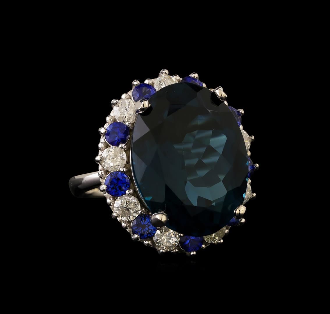 One electronically tested 14KT white gold ladies cast blue topaz, sapphire and diamond ring with a bright polish finish. The featured blue topaz is set within a sapphire and diamond bezel, completed by a two and one-half millimeter wide band. Identified with markings of "K14". Condition is new, good workmanship. Containing: One prong set oval mixed cut natural blue topaz, measuring 19.50 x 15.00 x 9.35mm, 6% bulge factor, approximate weight of 20.82ct., clarity is eye clean, type I, dark, very slightly grayish, very slightly greenish blue color, (GIA vslgB 7/3), cut is good. Transmitting light with no distortion, transparent. Graded in the setting. A deposit of a thin layer has been applied to the topaz to produce the intense color effect. The process utilizes a very high temperature treatment, diffusion of ions into the topaz, plus in some cases neutron bombardment has been used to create the color center. Diffusion processes causes the added ions to become part of the crystal surface with no distinct boundary. Do not put a gem treated in this manner into an ultrasonic cleaner. Nine prong set round brilliant cut natural blue sapphires, measuring 3.10 - 3.00 x 1.98 mm, approximate total weight of 1.35ct., clarity is slightly included, type II, dark, moderately strong, blue color, (GIA B 7/4), cut is good. Transmitting light with a minimum of distortion, transparent. Naturally occurring internal & external characteristics are present. Color grade is an average for the group. Indications of laboratory high temperature diffusion treatment. Graded in the setting. Nine prong set round brilliant cut diamonds, measuring 3.40 - 3.30 x 2.01mm (depth est.) approximate total weight of 9 Stones = 1.33ct. Graded in the setting. Clarity: I-1 to I-2. Color: G - H. Total Weight of Colored Stones 22.17ct. Total Weight of Diamonds 1.33ct. Total Weight of Ring 11.94 grams. AIG Appraised at $5,270.00.