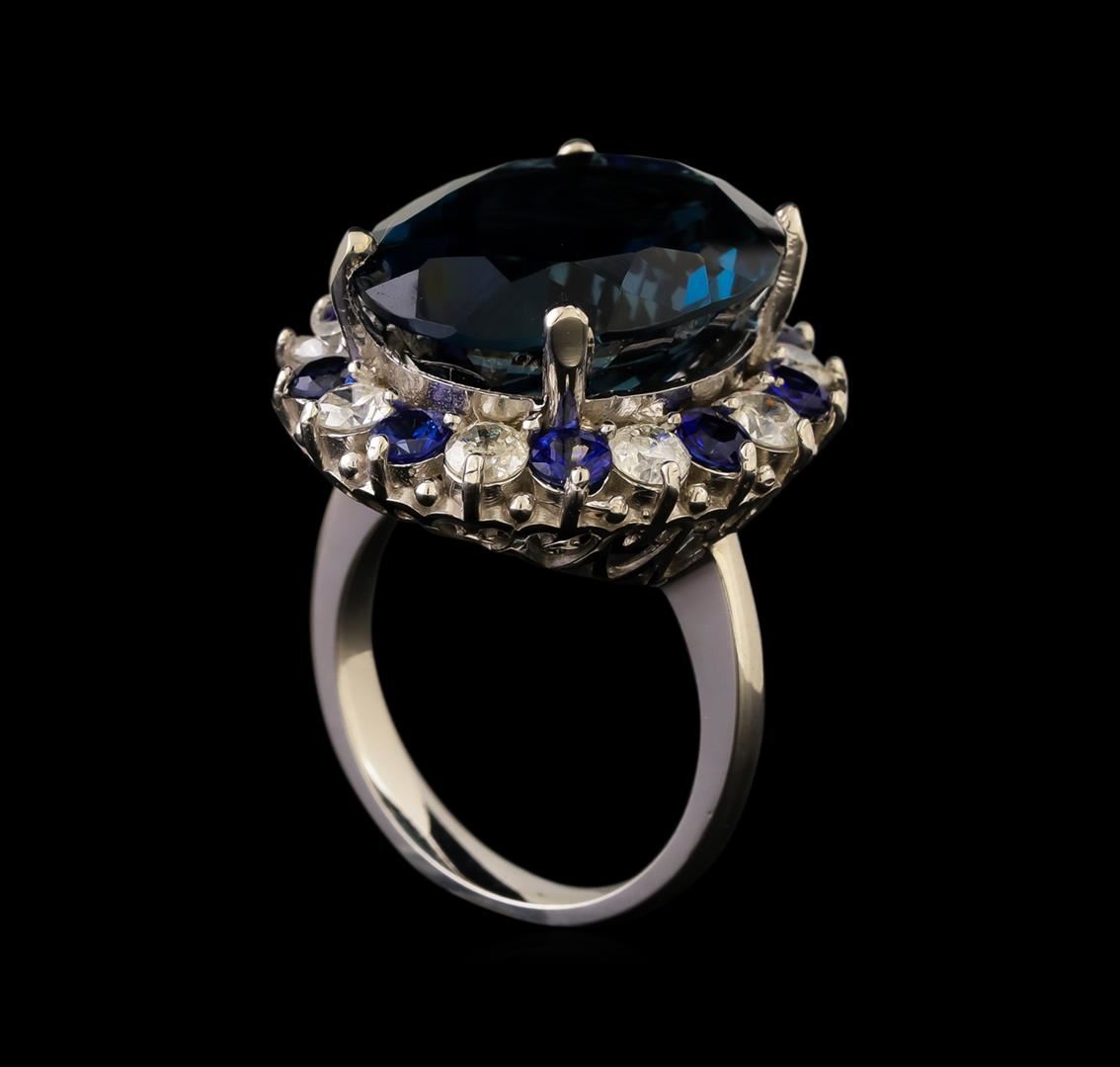 One electronically tested 14KT white gold ladies cast blue topaz, sapphire and diamond ring with a bright polish finish. The featured blue topaz is set within a sapphire and diamond bezel, completed by a two and one-half millimeter wide band. Identified with markings of "K14". Condition is new, good workmanship. Containing: One prong set oval mixed cut natural blue topaz, measuring 19.50 x 15.00 x 9.35mm, 6% bulge factor, approximate weight of 20.82ct., clarity is eye clean, type I, dark, very slightly grayish, very slightly greenish blue color, (GIA vslgB 7/3), cut is good. Transmitting light with no distortion, transparent. Graded in the setting. A deposit of a thin layer has been applied to the topaz to produce the intense color effect. The process utilizes a very high temperature treatment, diffusion of ions into the topaz, plus in some cases neutron bombardment has been used to create the color center. Diffusion processes causes the added ions to become part of the crystal surface with no distinct boundary. Do not put a gem treated in this manner into an ultrasonic cleaner. Nine prong set round brilliant cut natural blue sapphires, measuring 3.10 - 3.00 x 1.98 mm, approximate total weight of 1.35ct., clarity is slightly included, type II, dark, moderately strong, blue color, (GIA B 7/4), cut is good. Transmitting light with a minimum of distortion, transparent. Naturally occurring internal & external characteristics are present. Color grade is an average for the group. Indications of laboratory high temperature diffusion treatment. Graded in the setting. Nine prong set round brilliant cut diamonds, measuring 3.40 - 3.30 x 2.01mm (depth est.) approximate total weight of 9 Stones = 1.33ct. Graded in the setting. Clarity: I-1 to I-2. Color: G - H. Total Weight of Colored Stones 22.17ct. Total Weight of Diamonds 1.33ct. Total Weight of Ring 11.94 grams. AIG Appraised at $5,270.00.