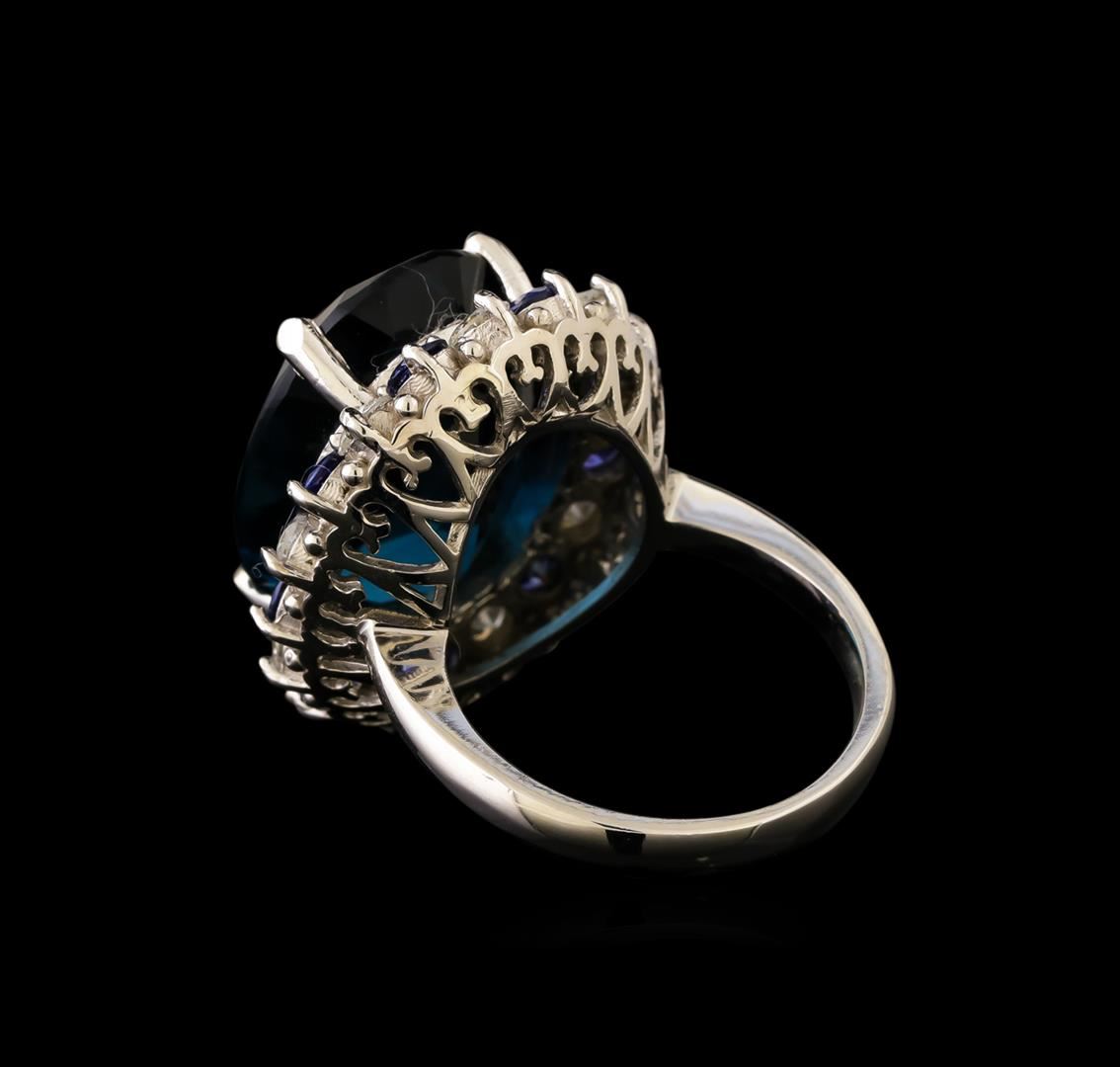 One electronically tested 14KT white gold ladies cast blue topaz, sapphire and diamond ring with a bright polish finish. The featured blue topaz is set within a sapphire and diamond bezel, completed by a two and one-half millimeter wide band. Identified with markings of "K14". Condition is new, good workmanship. Containing: One prong set oval mixed cut natural blue topaz, measuring 19.50 x 15.00 x 9.35mm, 6% bulge factor, approximate weight of 20.82ct., clarity is eye clean, type I, dark, very slightly grayish, very slightly greenish blue color, (GIA vslgB 7/3), cut is good. Transmitting light with no distortion, transparent. Graded in the setting. A deposit of a thin layer has been applied to the topaz to produce the intense color effect. The process utilizes a very high temperature treatment, diffusion of ions into the topaz, plus in some cases neutron bombardment has been used to create the color center. Diffusion processes causes the added ions to become part of the crystal surface with no distinct boundary. Do not put a gem treated in this manner into an ultrasonic cleaner. Nine prong set round brilliant cut natural blue sapphires, measuring 3.10 - 3.00 x 1.98 mm, approximate total weight of 1.35ct., clarity is slightly included, type II, dark, moderately strong, blue color, (GIA B 7/4), cut is good. Transmitting light with a minimum of distortion, transparent. Naturally occurring internal & external characteristics are present. Color grade is an average for the group. Indications of laboratory high temperature diffusion treatment. Graded in the setting. Nine prong set round brilliant cut diamonds, measuring 3.40 - 3.30 x 2.01mm (depth est.) approximate total weight of 9 Stones = 1.33ct. Graded in the setting. Clarity: I-1 to I-2. Color: G - H. Total Weight of Colored Stones 22.17ct. Total Weight of Diamonds 1.33ct. Total Weight of Ring 11.94 grams. AIG Appraised at $5,270.00.