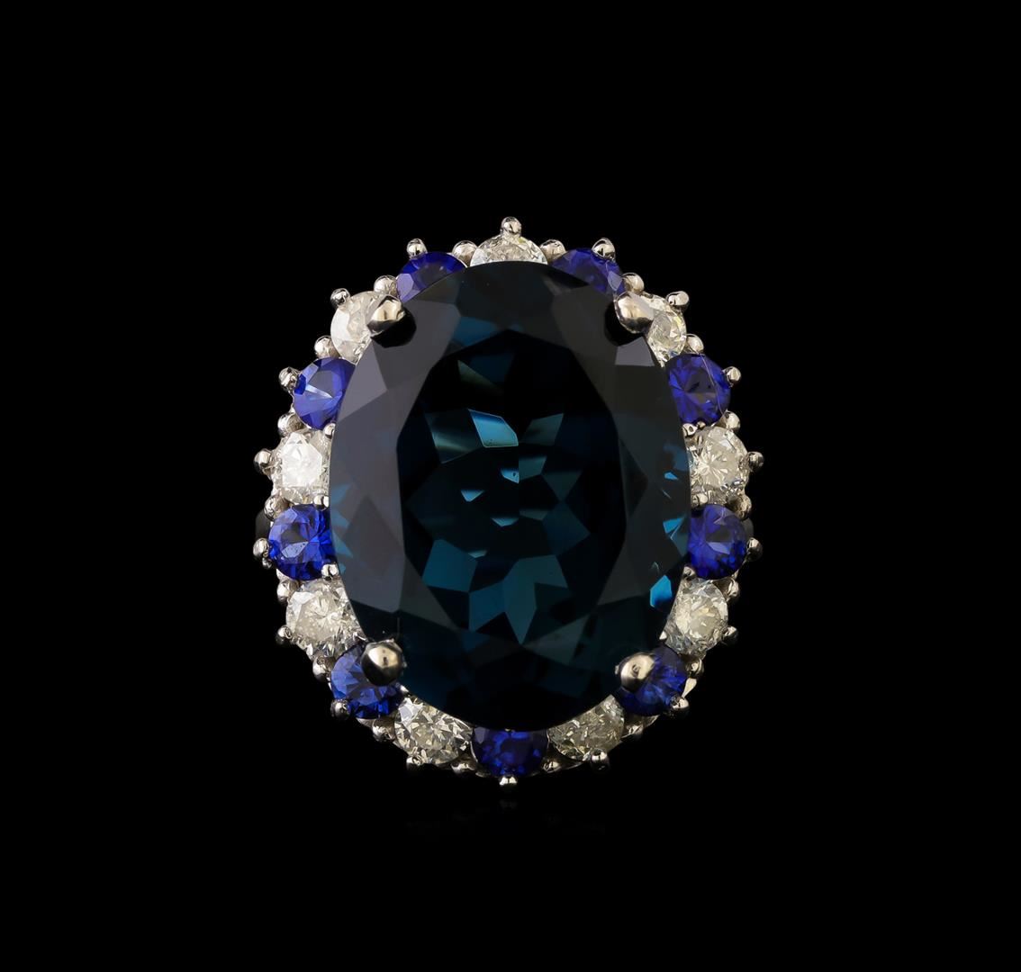 One electronically tested 14KT white gold ladies cast blue topaz, sapphire and diamond ring with a bright polish finish. The featured blue topaz is set within a sapphire and diamond bezel, completed by a two and one-half millimeter wide band. Identified with markings of "K14". Condition is new, good workmanship. Containing: One prong set oval mixed cut natural blue topaz, measuring 19.50 x 15.00 x 9.35mm, 6% bulge factor, approximate weight of 20.82ct., clarity is eye clean, type I, dark, very slightly grayish, very slightly greenish blue color, (GIA vslgB 7/3), cut is good. Transmitting light with no distortion, transparent. Graded in the setting. A deposit of a thin layer has been applied to the topaz to produce the intense color effect. The process utilizes a very high temperature treatment, diffusion of ions into the topaz, plus in some cases neutron bombardment has been used to create the color center. Diffusion processes causes the added ions to become part of the crystal surface with no distinct boundary. Do not put a gem treated in this manner into an ultrasonic cleaner. Nine prong set round brilliant cut natural blue sapphires, measuring 3.10 - 3.00 x 1.98 mm, approximate total weight of 1.35ct., clarity is slightly included, type II, dark, moderately strong, blue color, (GIA B 7/4), cut is good. Transmitting light with a minimum of distortion, transparent. Naturally occurring internal & external characteristics are present. Color grade is an average for the group. Indications of laboratory high temperature diffusion treatment. Graded in the setting. Nine prong set round brilliant cut diamonds, measuring 3.40 - 3.30 x 2.01mm (depth est.) approximate total weight of 9 Stones = 1.33ct. Graded in the setting. Clarity: I-1 to I-2. Color: G - H. Total Weight of Colored Stones 22.17ct. Total Weight of Diamonds 1.33ct. Total Weight of Ring 11.94 grams. AIG Appraised at $5,270.00.