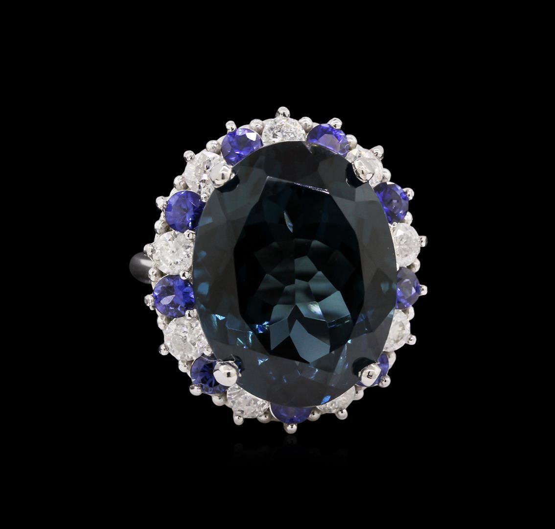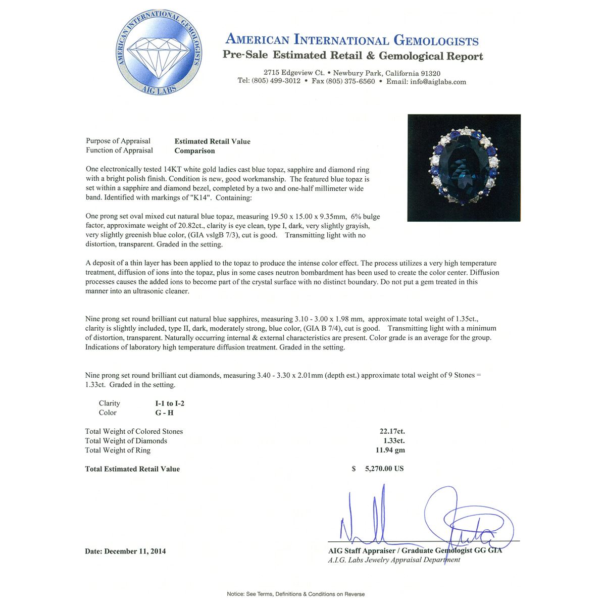 One electronically tested 14KT white gold ladies cast blue topaz, sapphire and diamond ring with a bright polish finish. The featured blue topaz is set within a sapphire and diamond bezel, completed by a two and one-half millimeter wide band. Identified with markings of "K14". Condition is new, good workmanship. Containing: One prong set oval mixed cut natural blue topaz, measuring 19.50 x 15.00 x 9.35mm, 6% bulge factor, approximate weight of 20.82ct., clarity is eye clean, type I, dark, very slightly grayish, very slightly greenish blue color, (GIA vslgB 7/3), cut is good. Transmitting light with no distortion, transparent. Graded in the setting. A deposit of a thin layer has been applied to the topaz to produce the intense color effect. The process utilizes a very high temperature treatment, diffusion of ions into the topaz, plus in some cases neutron bombardment has been used to create the color center. Diffusion processes causes the added ions to become part of the crystal surface with no distinct boundary. Do not put a gem treated in this manner into an ultrasonic cleaner. Nine prong set round brilliant cut natural blue sapphires, measuring 3.10 - 3.00 x 1.98 mm, approximate total weight of 1.35ct., clarity is slightly included, type II, dark, moderately strong, blue color, (GIA B 7/4), cut is good. Transmitting light with a minimum of distortion, transparent. Naturally occurring internal & external characteristics are present. Color grade is an average for the group. Indications of laboratory high temperature diffusion treatment. Graded in the setting. Nine prong set round brilliant cut diamonds, measuring 3.40 - 3.30 x 2.01mm (depth est.) approximate total weight of 9 Stones = 1.33ct. Graded in the setting. Clarity: I-1 to I-2. Color: G - H. Total Weight of Colored Stones 22.17ct. Total Weight of Diamonds 1.33ct. Total Weight of Ring 11.94 grams. AIG Appraised at $5,270.00.