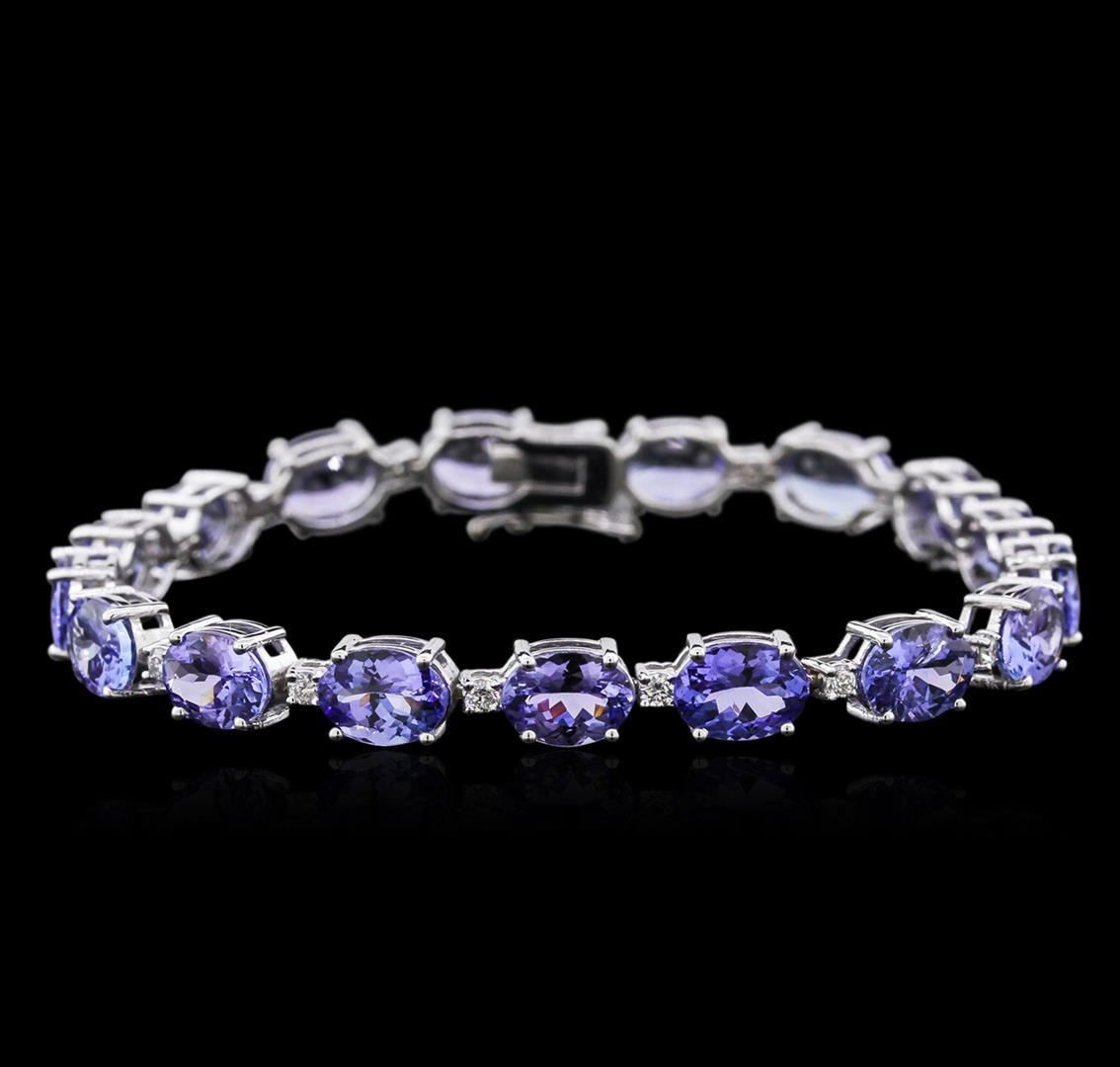 One electronically tested 14KT white gold ladies cast tanzanite and diamond bracelet with a hidden box clasp with safety closer with a bright polish finish. Measurements: 7" in length Identified with markings of "14K". Condition is new. Containing: Seventeen prong set oval modified brilliant cut natural tanzanites, measuring 8.00 x 6.00 x 3.90mm, approximate total weight of 20.83ct., clarity is eye clean, type I, medium light, very slightly grayish, violet color, (GIA V 4/3), cut is good. Seventeen prong set round brilliant cut diamonds, measuring 2.00 - 2.00 x 1.20mm (depth est.) approximate total weight of 17 Stones = 0.58ct. Clarity: SI-1 to SI-2. Color: I - J, Cut is Good. Colored gemstones are presumed to have been subjected to commonly used enhancement processes. All diamonds and colored gemstones are graded in the mounting, unless otherwise stated. Total Weight of Colored Stones 20.83ct. Total Weight of Diamonds 0.58ct. Total Weight of Bracelet 13.70 grams. GGL Appraised at $8,815.00.
