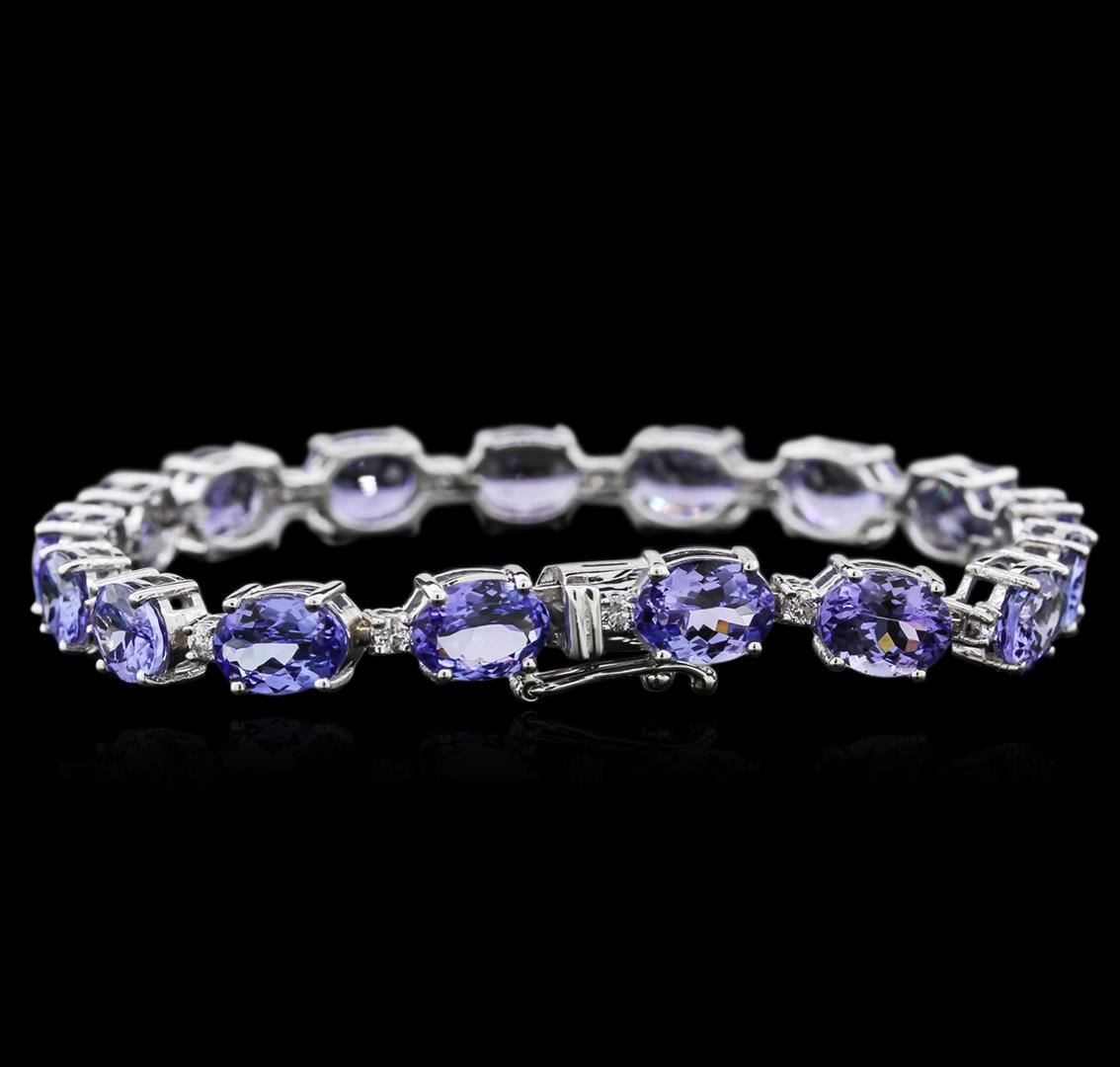 One electronically tested 14KT white gold ladies cast tanzanite and diamond bracelet with a hidden box clasp with safety closer with a bright polish finish. Measurements: 7" in length Identified with markings of "14K". Condition is new. Containing: Seventeen prong set oval modified brilliant cut natural tanzanites, measuring 8.00 x 6.00 x 3.90mm, approximate total weight of 20.83ct., clarity is eye clean, type I, medium light, very slightly grayish, violet color, (GIA V 4/3), cut is good. Seventeen prong set round brilliant cut diamonds, measuring 2.00 - 2.00 x 1.20mm (depth est.) approximate total weight of 17 Stones = 0.58ct. Clarity: SI-1 to SI-2. Color: I - J, Cut is Good. Colored gemstones are presumed to have been subjected to commonly used enhancement processes. All diamonds and colored gemstones are graded in the mounting, unless otherwise stated. Total Weight of Colored Stones 20.83ct. Total Weight of Diamonds 0.58ct. Total Weight of Bracelet 13.70 grams. GGL Appraised at $8,815.00.