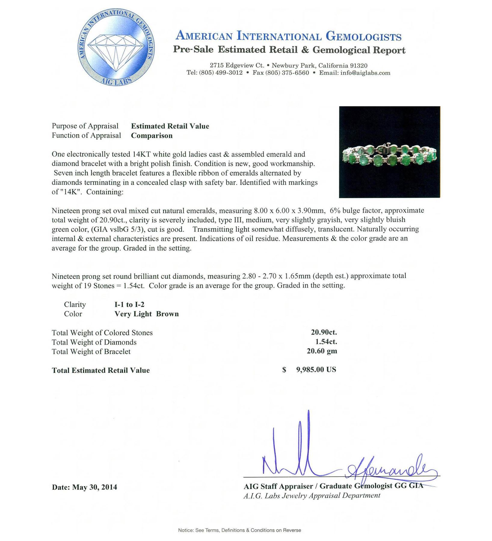 One electronically tested 14KT white gold ladies cast & assembled emerald and diamond bracelet with a bright polish finish. Condition is new, good workmanship. Seven inch length bracelet features a flexible ribbon of emeralds alternated by diamonds terminating in a concealed clasp with safety bar. Identified with markings of "14K". Containing: Nineteen prong set oval mixed cut natural emeralds, measuring 8.00 x 6.00 x 3.90mm, 6%. bulge factor, approximate. Total Weight of 20.90ct., clarity is severely included, type III, medium, very slightly grayish, very slightly bluish green color, (GIA vslbG 5/3), cut is good. Transmitting light somewhat diffusely, translucent. Naturally occurring internal & external characteristics are present. Indications of oil residue. Measurements & the color grade are an average for the group. Graded in the setting. Nineteen prong set round brilliant cut diamonds, measuring 2.80 - 2.70 x 1.65mm (depth est.) approximate. Total Weight of 19 Stones = 1.54ct. Color grade is an average for the group. Graded in the setting. Clarity: I-1 to I-2. Total Weight of Colored Stones 20.90ct. Total Weight of Diamonds 1.54ct. Total Weight of Bracelet 20.60 grams. AIG Appraised at $9,985.00.