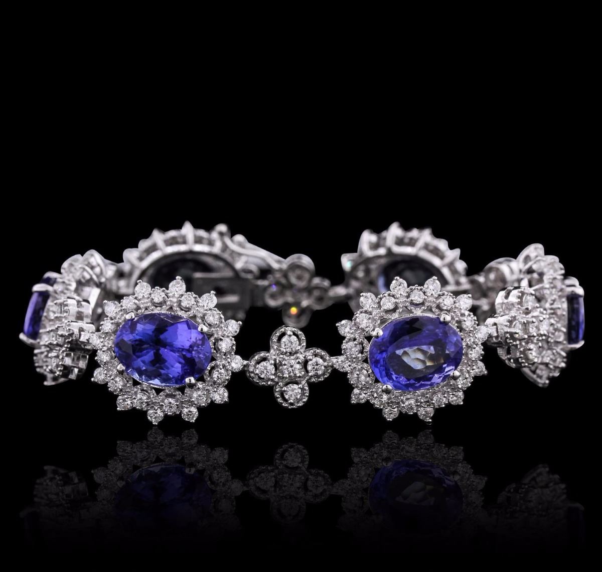 One electronically tested 14KT white gold ladies combination cast & assembled bracelet with a hidden box clasp with a bright polish finish. Measurements: 6.85" in length. Identified with markings of "14K". Condition is new. Containing: Six prong set oval modified brilliant cut natural tanzanites, measuring 10.90 x 8.50 x 5.54mm, approximate total weight of 20.94ct., clarity is eye clean, type I, medium, moderately strong, bluish violet color, (GIA bV 5/4), cut is good. One Hundred Sixty-Eight prong set round brilliant cut diamonds, measuring 1.80 - 1.80 x 1.08mm (depth est.) approximate total weight of 168 Stones = 3.58ct. Clarity: SI-1 to I-1. Color: H - I, Cut is Good. Colored gemstones are presumed to have been subjected to commonly used enhancement processes. All diamonds and colored gemstones are graded in the mounting, unless otherwise stated. Total Weight of Colored Stones 20.94ct. Total Weight of Diamonds 3.58ct. Total Weight of Bracelet 27.80 grams. GGL Appraised at $45,210.00.