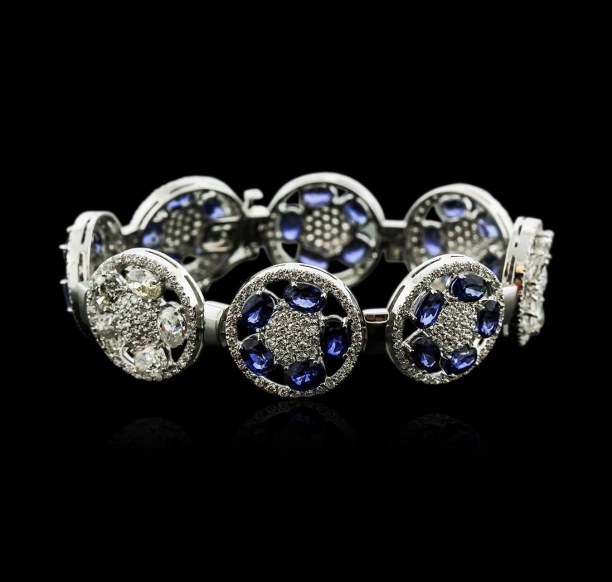 One electronically tested 14KT white gold ladies cast sapphire and diamond bracelet with a hidden box clasp with a bright polish finish. Measurements: 6.75" in length Identified with markings of "14K". Condition is new. Containing: Thirty prong set oval modified brilliant cut natural blue sapphires, measuring 5.80 x 4.70 x 3.06mm, approximate total weight of 21.00ct., clarity is eye clean, type II, medium, moderately strong, blue color, (GIA B 5/4), cut is good. Ten prong set oval shaped cut diamonds, measuring 5.80 x 4.50 x 3.00mm (depth est.) approximate total weight of 10 Stones = 4.93ct. Clarity: I-1 to I-3. Color: I - K, Cut is Good. Four Hundred Twenty-Four prong set round brilliant cut diamonds, measuring 1.50 - 1.50 x 0.90mm (depth est.) approximate total weight of 424 Stones = 5.22ct. Clarity: SI-2 to I-1. Color: H - I, Cut is Good. Colored gemstones are presumed to have been subjected to commonly used enhancement processes. All diamonds and colored gemstones are graded in the mounting, unless otherwise stated. Total Weight of Colored Stones 21.00ct. Total Weight of Diamonds 10.15ct. Total Weight of Bracelet 30.00 grams. GGL Appraised.