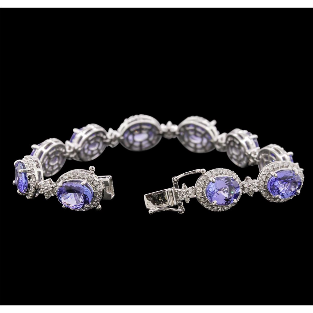 One electronically tested 14KT white gold Ladies combination cast & assembled bracelet with a hidden box clasp with a bright polish finish. Condition is new. Measurements: 7" in length. Identified with markings of "14K". Containing: Ten prong set oval modified brilliant cut natural tanzanites, measuring 9.24 x 7.45 x 4.50mm, approximate. Total Weight of 21.00ct., clarity is eye clean, type I, medium, very slightly grayish, violet color, (GIA V 5/3), cut is very good. Colored gemstones are presumed to have been subjected to commonly used color/clarity enhancement processes. Two Hundred Ninety prong set round brilliant cut diamonds, measuring 1.40 - 1.40 x 0.84mm (depth est.) approximate. Total Weight of 290 Stones = 2.90ct. Clarity: I-1 to I-2. Color: I - J, Cut is Good. Total Weight of Colored Stones 21.00ct. Total Weight of Diamonds 2.90ct. Total Weight of Bracelet 25.30 Grams. GGL Appraised at $43,235.00.