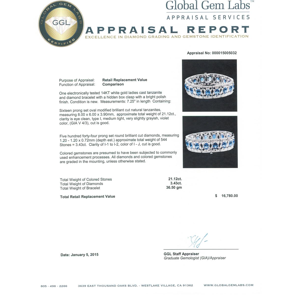 One electronically tested 14KT white gold ladies cast tanzanite and diamond bracelet with a hidden box clasp with a bright polish finish. Measurements: 7.25" in length Condition is new. Containing: Sixteen prong set oval modified brilliant cut natural tanzanites, measuring 8.00 x 6.00 x 3.90mm, approximate total weight of 21.12ct., clarity is eye clean, type I, medium light, very slightly grayish, violet color, (GIA V 4/3), cut is good. Five Hundred Forty-Four prong set round brilliant cut diamonds, measuring 1.20 - 1.20 x 0.72mm (depth est.) approximate total weight of 544 Stones = 3.43ct. Clarity: I-1 to I-2. Color: I - J, Cut is Good. Colored gemstones are presumed to have been subjected to commonly used enhancement processes. All diamonds and colored gemstones are graded in the mounting, unless otherwise stated. Total Weight of Colored Stones 21.12ct. Total Weight of Diamonds 3.43ct. Total Weight of Bracelet 36.50 grams. GGL Appraised at $16,780.00.