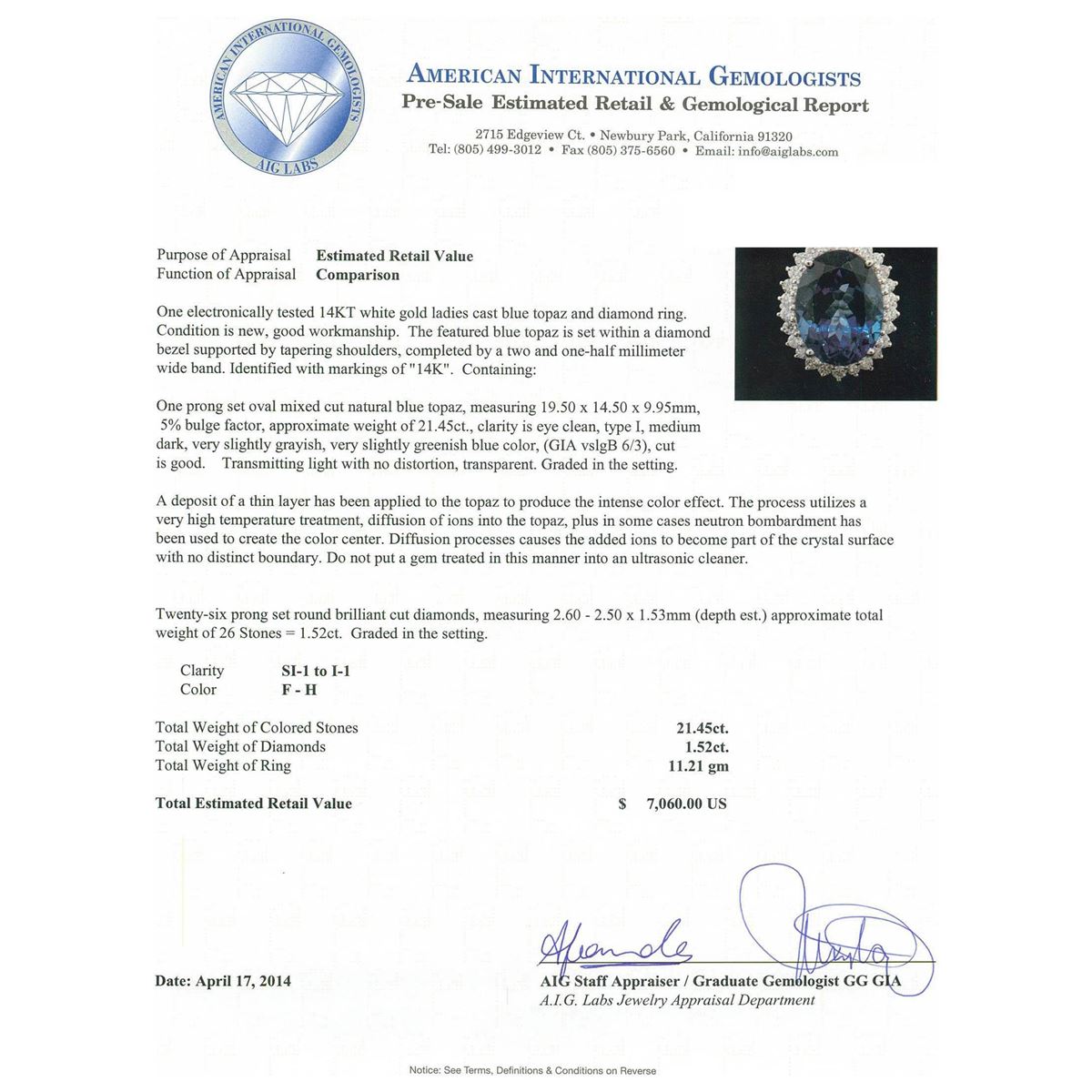 One electronically tested 14KT white gold ladies cast blue topaz and diamond ring. Condition is new, good workmanship. The featured blue topaz is set within a diamond bezel supported by tapering shoulders, completed by a two and one-half millimeter wide band. Identified with markings of "14K". Containing: One prong set oval mixed cut natural blue topaz, measuring 19.50 x 14.50 x 9.95mm, 5%. bulge factor, approximate weight of 21.45ct., clarity is eye clean, type I, medium dark, very slightly grayish, very slightly greenish blue color, (GIA vslgB 6/3), cut is good. Transmitting light with no distortion, transparent. Graded in the setting. A deposit of a thin layer has been applied to the topaz to produce the intense color effect. The process utilizes a very high temperature treatment, diffusion of ions into the topaz, plus in some cases neutron bombardment has been used to create the color center. Diffusion processes causes the added ions to become part of the crystal surface with no distinct boundary. Do not put a gem treated in this manner into an ultrasonic cleaner. Twenty-Six prong set round brilliant cut diamonds, measuring 2.60 - 2.50 x 1.53mm (depth est.) approximate. Total Weight of 26 Stones = 1.52ct. Graded in the setting. Clarity: SI-1 to I-1. Color: F - H. Total Weight of Colored Stones 21.45ct. Total Weight of Diamonds 1.52ct. Total Weight of Ring 11.21 grams. AIG Appraised at $7,060.00.