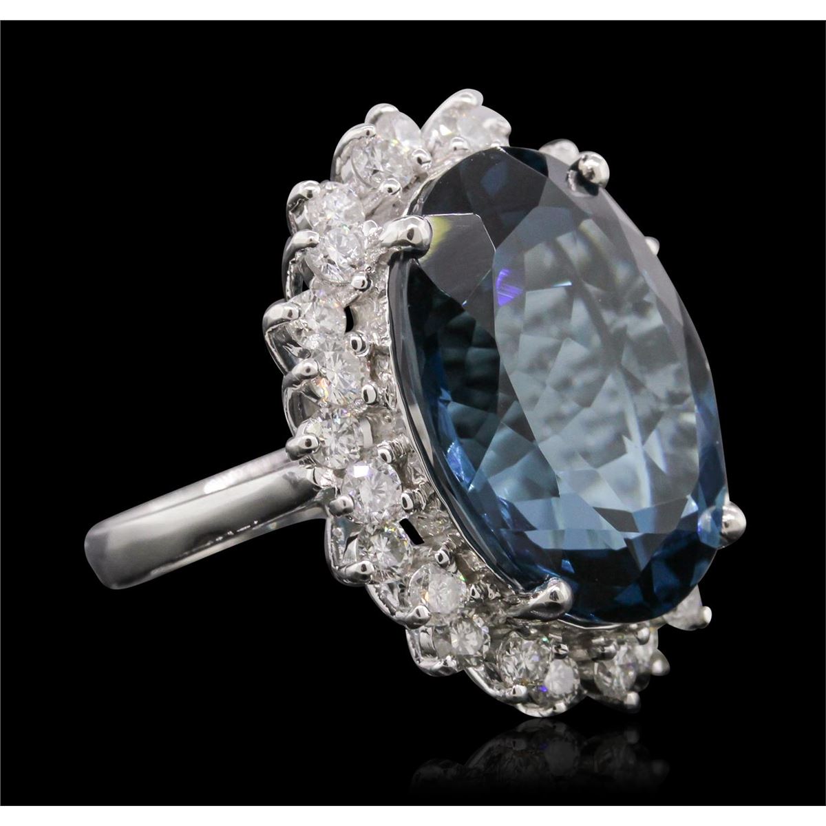 One electronically tested 14KT white gold ladies cast blue topaz and diamond ring. Condition is new, good workmanship. The featured blue topaz is set within a diamond bezel supported by tapering shoulders, completed by a two and one-half millimeter wide band. Identified with markings of "14K". Containing: One prong set oval mixed cut natural blue topaz, measuring 19.50 x 14.50 x 9.95mm, 5%. bulge factor, approximate weight of 21.45ct., clarity is eye clean, type I, medium dark, very slightly grayish, very slightly greenish blue color, (GIA vslgB 6/3), cut is good. Transmitting light with no distortion, transparent. Graded in the setting. A deposit of a thin layer has been applied to the topaz to produce the intense color effect. The process utilizes a very high temperature treatment, diffusion of ions into the topaz, plus in some cases neutron bombardment has been used to create the color center. Diffusion processes causes the added ions to become part of the crystal surface with no distinct boundary. Do not put a gem treated in this manner into an ultrasonic cleaner. Twenty-Six prong set round brilliant cut diamonds, measuring 2.60 - 2.50 x 1.53mm (depth est.) approximate. Total Weight of 26 Stones = 1.52ct. Graded in the setting. Clarity: SI-1 to I-1. Color: F - H. Total Weight of Colored Stones 21.45ct. Total Weight of Diamonds 1.52ct. Total Weight of Ring 11.21 grams. AIG Appraised at $7,060.00.