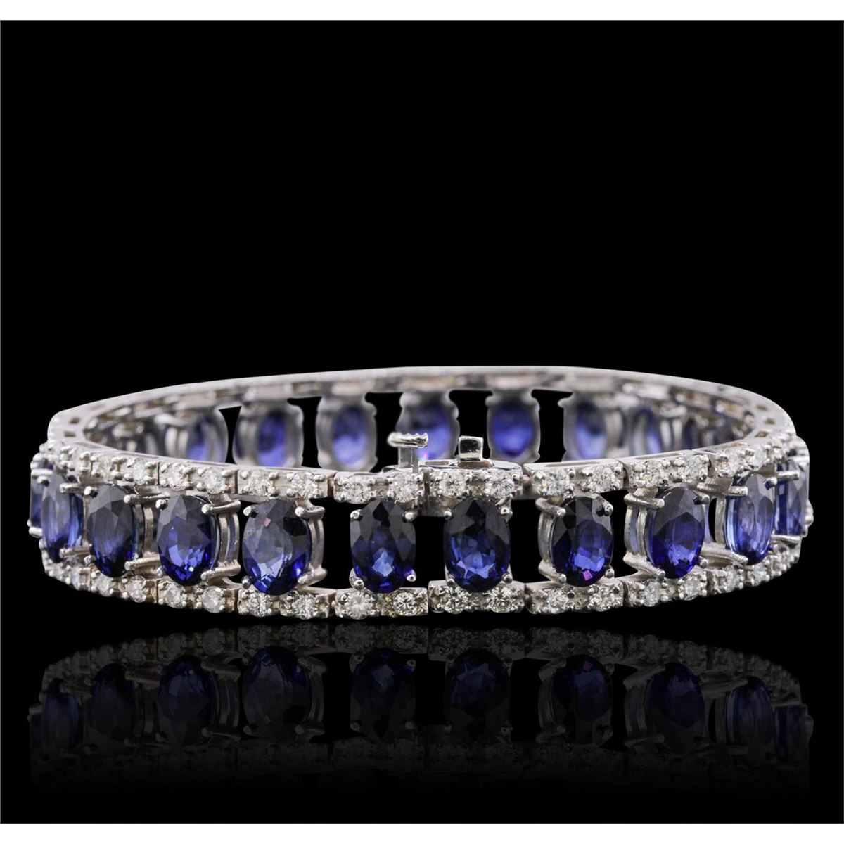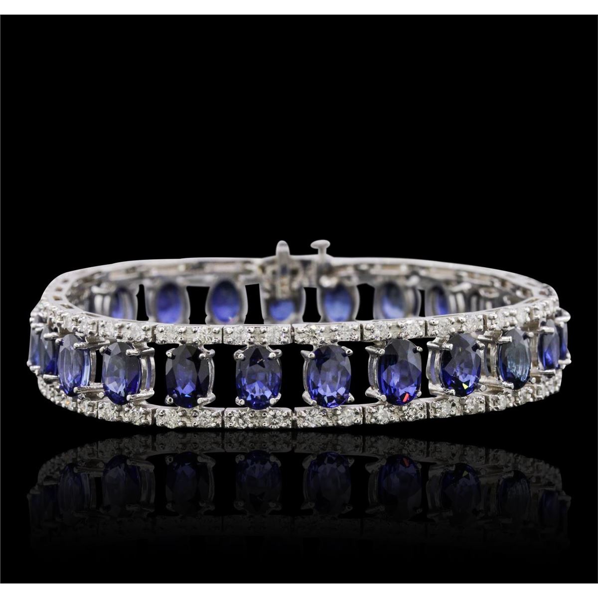 One electronically tested 14KT white gold ladies combination cast & assembled sapphire and diamond bracelet with a bright polish finish. Measurements: 7" in length. Identified with markings of "14K". Condition is new. Containing: Twenty-five prong set oval modified brilliant cut natural blue sapphires, measuring 6.91 x 4.81 x 3.12mm, approximate total weight of 21.50ct., clarity is eye clean, type II, medium, moderately strong, violet color, (GIA V 5/4), cut is good. One Hundred prong set round brilliant cut diamonds, measuring 1.50 - 1.50 x 0.90mm (depth est.) approximate total weight of 100 Stones = 1.23ct. Clarity: SI-2 to I-2. Color: I - J, Cut is Good. Colored gemstones are presumed to have been subjected to commonly used enhancement processes. All diamonds and colored gemstones are graded in the mounting, unless otherwise stated. Total Weight of Colored Stones 21.50ct. Total Weight of Diamonds 1.23ct. Total Weight of Bracelet 28.60 grams. GGL Appraised at $21,170.00.