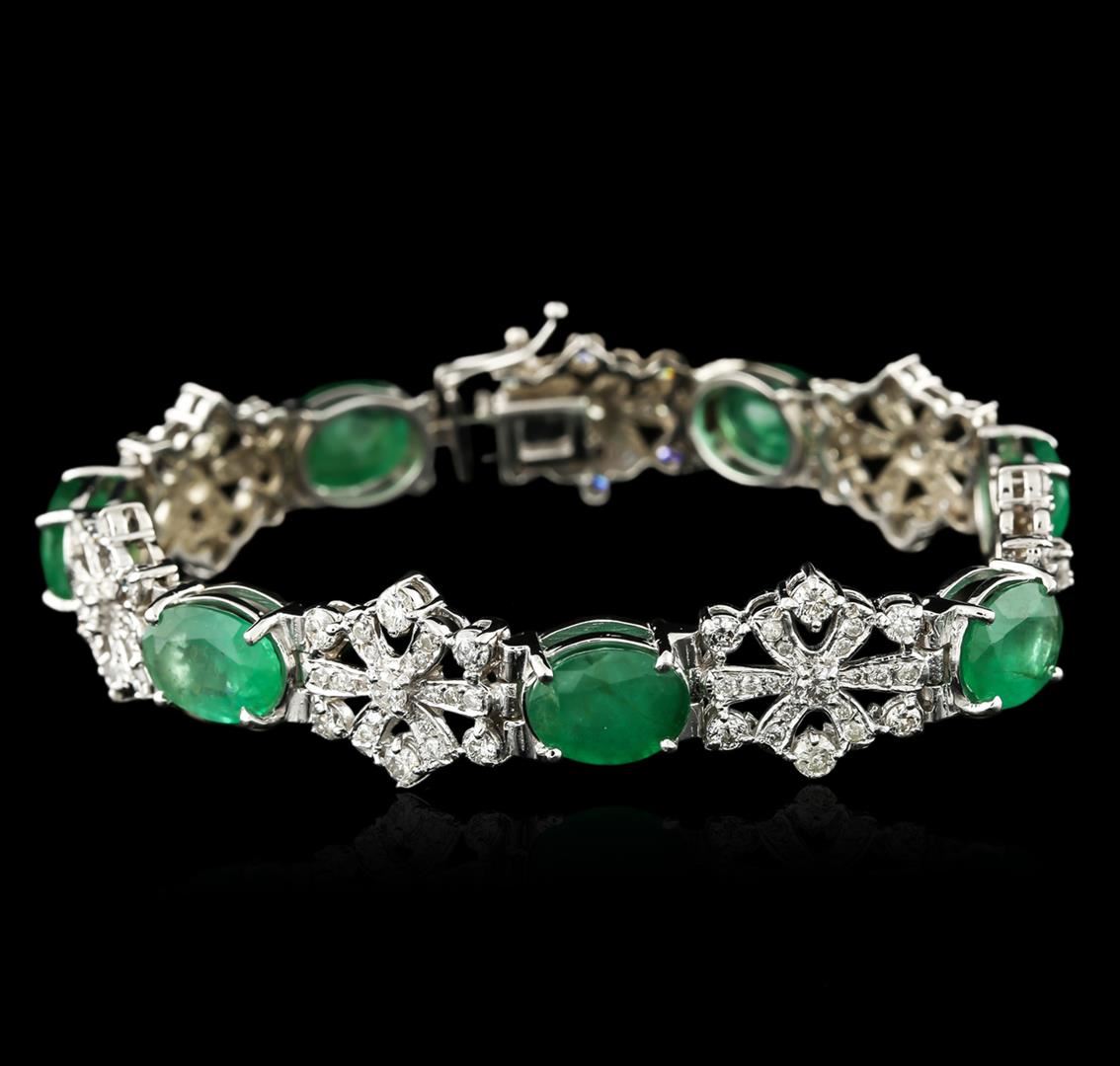 One electronically tested 14KT white gold ladies cast emerald and diamond bracelet with a hidden box clasp with a bright polish finish. Measurements: 8" in length Identified with markings of "14K". Condition is new. Containing: Seven prong set oval modified brilliant cut natural emeralds, measuring 11.50 x 8.50 x 5.53mm, approximate total weight of 21.63ct., clarity is heavily included, type III, medium light, very slightly grayish, green color, (GIA G 4/3), cut is good. Ninety-Eight prong set round brilliant cut diamonds, measuring 1.30 - 1.30 x 0.78mm (depth est.) approximate total weight of 98 Stones = 0.78ct. Clarity: I-1 to I-2. Color: I - J, Cut is Good. Forty-Nine prong set round brilliant cut diamonds, measuring 2.80 - 2.80 x 1.68mm (depth est.) approximate total weight of 49 Stones = 3.94ct. Clarity: SI-2 to I-2. Color: I - J, Cut is Good. Diamonds and colored gemstones are graded in the mounting, unless otherwise stated. Colored gemstones are presumed to have been subjected to commonly used enhancement processes. Total Weight of Colored Stones 21.63ct. Total Weight of Diamonds 4.72ct. Total Weight of Bracelet 31.70 grams. GGL Appraised at $14,255.00.