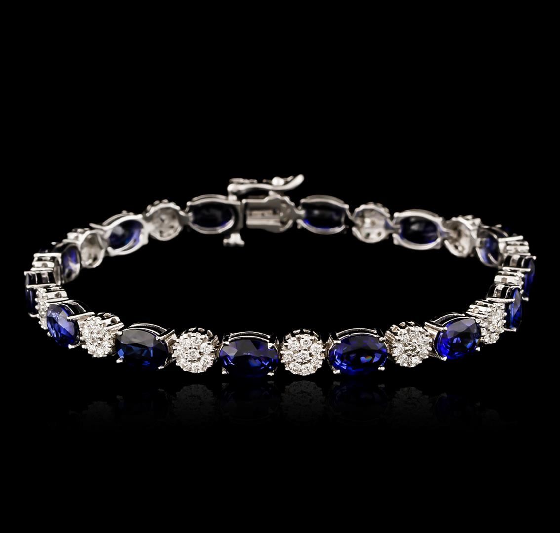 One electronically tested 14KT white gold ladies cast sapphire and diamond bracelet with a hidden box clasp with safety closer with a bright polish finish. Measurements: 7" in length. Identified with markings of "14K". Condition is new. Containing: Fourteen prong set oval modified brilliant cut natural blue sapphires, measuring 8.00. x 6.00. x 3.90mm, approximate total weight of 21.98ct., clarity is eye clean, type II, medium, moderately strong, blue color, (GIA B 5/4), cut is good. One Hundred Twelve prong set round brilliant cut diamonds, measuring 1.40 - 1.40 x 0.84mm (depth est.) approximate total weight of 112 Stones = 1.12ct. Clarity: SI-1 to SI-2. Color: I - J, Cut is Good. Colored gemstones are presumed to have been subjected to commonly used enhancement processes. All diamonds and colored gemstones are graded in the mounting, unless otherwise stated. Total Weight of Colored Stones 21.98ct. Total Weight of Diamonds 1.12ct. Total Weight of Bracelet 13.90 grams. GGL Appraised at $6,810.00.