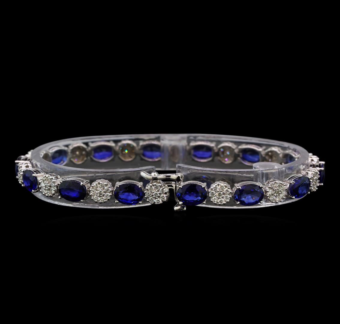 One electronically tested 14KT white gold ladies cast sapphire and diamond bracelet with a hidden box clasp with safety closer with a bright polish finish. Measurements: 7" in length. Identified with markings of "14K". Condition is new. Containing: Fourteen prong set oval modified brilliant cut natural blue sapphires, measuring 8.00. x 6.00. x 3.90mm, approximate total weight of 21.98ct., clarity is eye clean, type II, medium, moderately strong, blue color, (GIA B 5/4), cut is good. One Hundred Twelve prong set round brilliant cut diamonds, measuring 1.40 - 1.40 x 0.84mm (depth est.) approximate total weight of 112 Stones = 1.12ct. Clarity: SI-1 to SI-2. Color: I - J, Cut is Good. Colored gemstones are presumed to have been subjected to commonly used enhancement processes. All diamonds and colored gemstones are graded in the mounting, unless otherwise stated. Total Weight of Colored Stones 21.98ct. Total Weight of Diamonds 1.12ct. Total Weight of Bracelet 13.90 grams. GGL Appraised at $6,810.00.