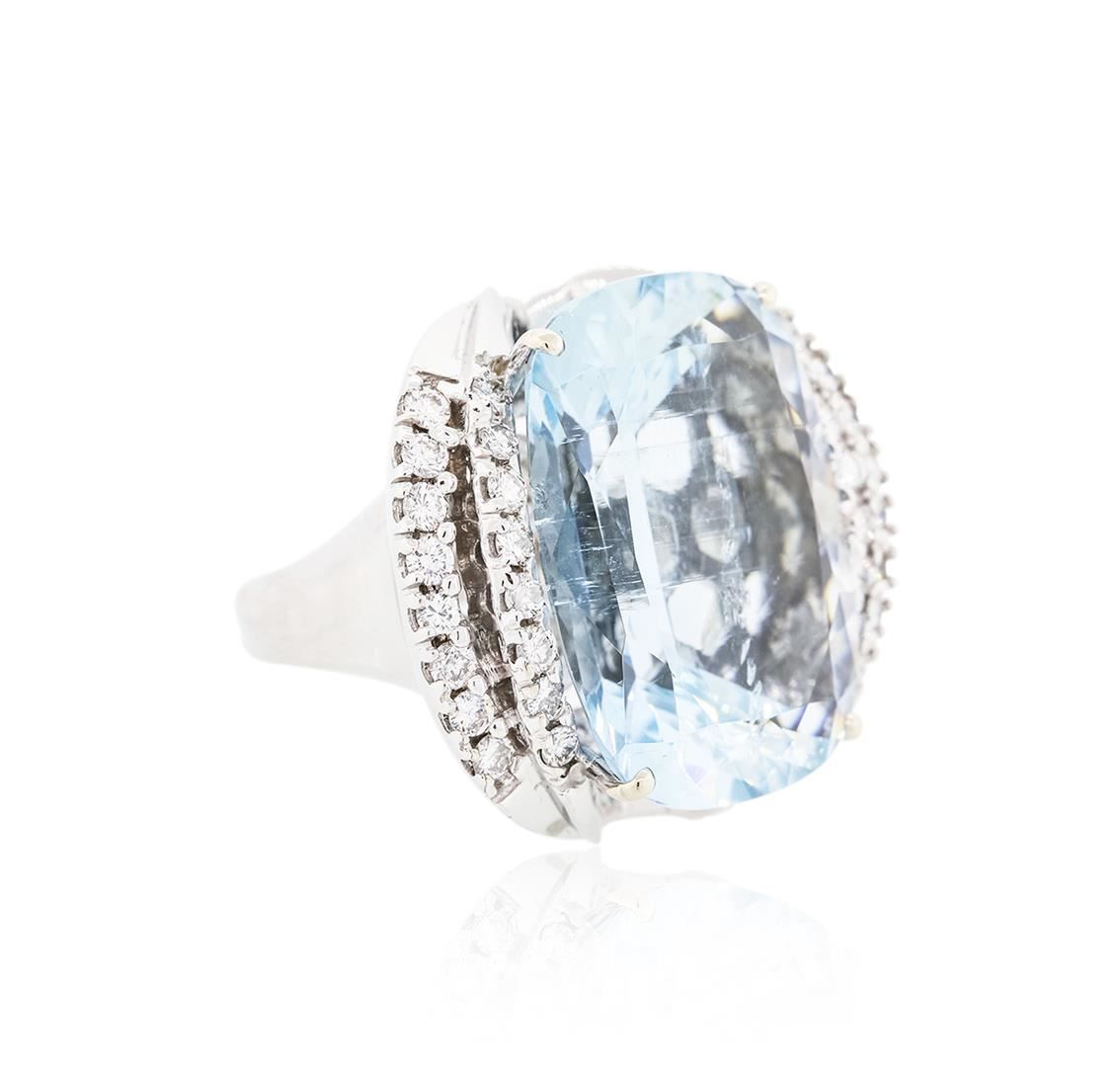 One electronically tested 14KT white gold ladies custom cast & assembled aquamarine & diamond ring with a bright finish. The featured aquamarine is set within mirroring diamond ribbons, supported by an elaborate under gallery and tapering shoulders, completed by a three millimeter wide band. Condition is good. Containing: One prong set oval mixed cut natural aquamarine, measuring 24.20 x 18.00 x 9.00mm, approximate weight of 22.00ct., clarity is moderately included, type I, medium, very slightly grayish, very slightly greenish blue color, (GIA vslgB 5/3), cut is good. Transmitting light with no distortion, transparent. Naturally occurring internal & external characteristics are present. Colored Stone Grading Report attached. Graded in the setting. Thirty-Two prong set round brilliant cut diamonds, measuring 2.25 - 2.20 x 1.34mm (depth est.) approximate total weight of 32 Stones = 1.30ct. The clarity grade reflects the overall average for the group. Graded in the setting. Clarity VS-1 to VS-2. Color H -- I. Total Weight of Colored Stones 22.00ct. Total Weight of Diamonds 1.30ct. Total Weight of Ring 22.01 grams. AIG Appraised at $24,000.00.