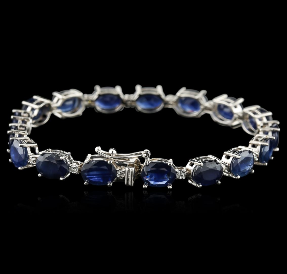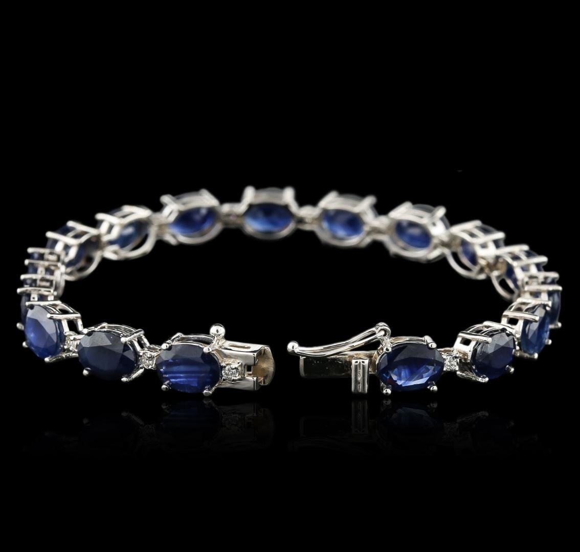 One electronically tested 14KT white gold ladies combination cast & assembled sapphire and diamond bracelet with a hidden box clasp with safety closer with a bright polish finish. Condition is new. Containing: Seventeen prong set oval modified brilliant cut natural blue sapphires, measuring 8.20 x 5.84 x 3.23mm, approximate total weight of 22.10ct., clarity is moderately included, type II, medium dark, very slightly grayish, blue color, (GIA B 6/3), cut is good. Seventeen prong set round brilliant cut diamonds, measuring 1.80 - 1.80 x 1.08mm (depth est.) approximate total weight of 17 Stones = 0.36ct. Clarity: SI-2 to I-1. Color: I - J, Cut is Good. Colored gemstones are presumed to have been subjected to commonly used enhancement processes. Diamonds and colored gemstones are graded in the mounting, unless otherwise stated. Total Weight of Colored Stones 22.10ct. Total Weight of Diamonds 0.36ct. Total Weight of Bracelet 14.30 grams. GGL Appraised at $6,415.00.
