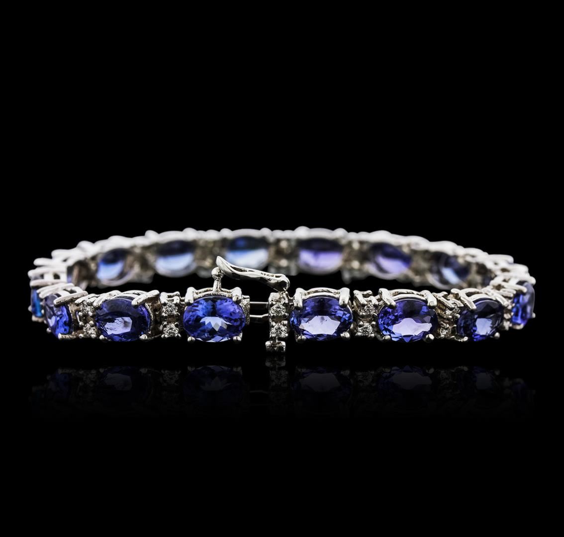 One electronically tested 14KT white gold ladies cast tanzanite and diamond bracelet with a bright polish finish. Measurements: 7" in length Identified with markings of "14K". Condition is new. Containing: Sixteen prong set oval modified brilliant cut natural tanzanites, measuring 8.50 x 6.00 x 3.91mm, approximate total weight of 22.40ct., clarity is eye clean, type I, medium light, very slightly grayish, violet color, (GIA V 4/3), cut is good. Thirty-Two prong set round brilliant cut diamonds, measuring 1.90 - 1.90 x 1.14mm (depth est.) approximate total weight of 32 Stones = 0.80ct. Clarity: SI-1 to SI-2. Color: J - K, Cut is Good. Colored gemstones are presumed to have been subjected to commonly used enhancement processes. All diamonds and colored gemstones are graded in the mounting, unless otherwise stated. Total Weight of Colored Stones 22.40ct. Total Weight of Diamonds 0.80ct. Total Weight of Bracelet 20.90 grams. GGL Appraised at $10,570.00.