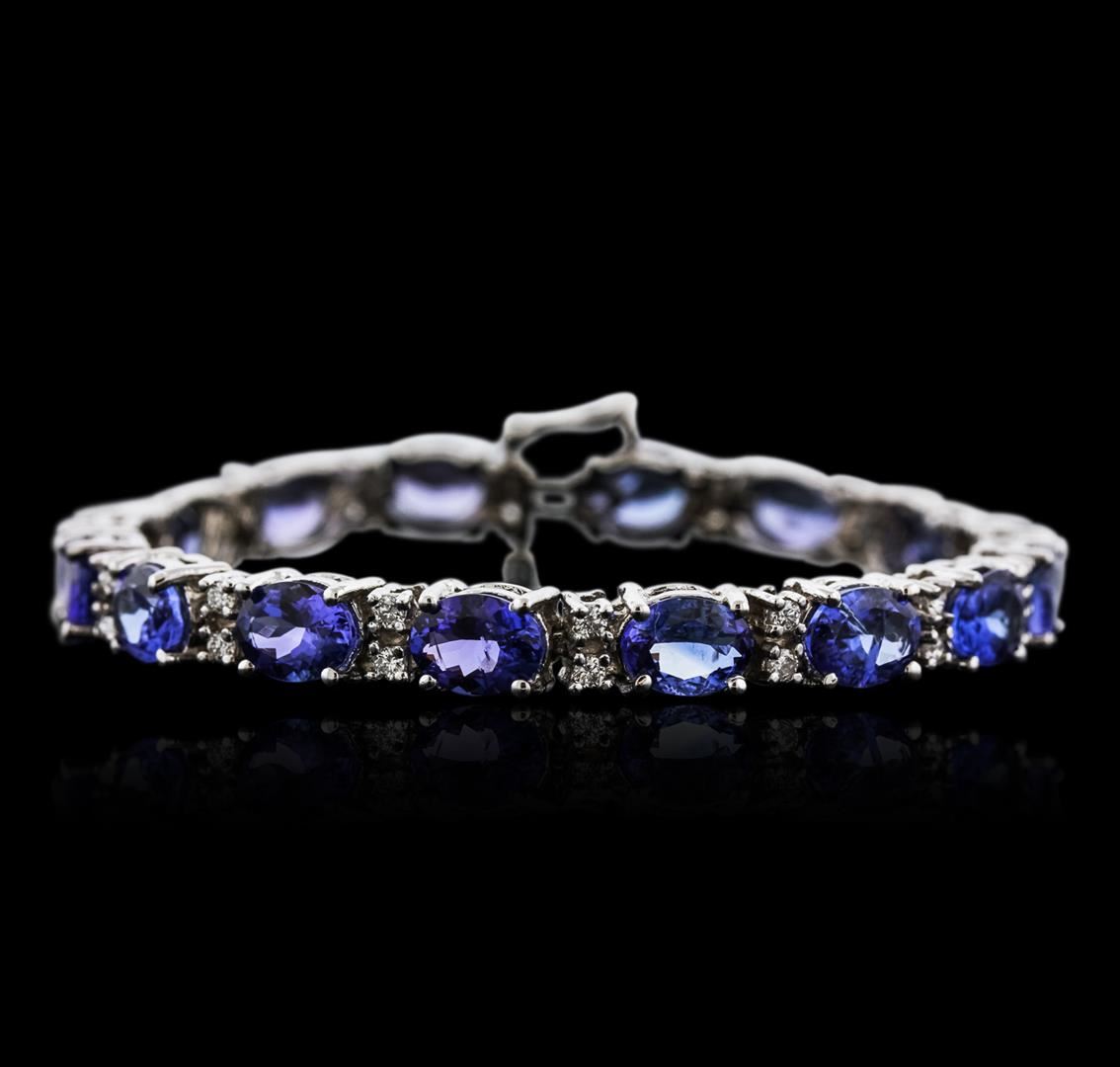 One electronically tested 14KT white gold ladies cast tanzanite and diamond bracelet with a bright polish finish. Measurements: 7" in length Identified with markings of "14K". Condition is new. Containing: Sixteen prong set oval modified brilliant cut natural tanzanites, measuring 8.50 x 6.00 x 3.91mm, approximate total weight of 22.40ct., clarity is eye clean, type I, medium light, very slightly grayish, violet color, (GIA V 4/3), cut is good. Thirty-Two prong set round brilliant cut diamonds, measuring 1.90 - 1.90 x 1.14mm (depth est.) approximate total weight of 32 Stones = 0.80ct. Clarity: SI-1 to SI-2. Color: J - K, Cut is Good. Colored gemstones are presumed to have been subjected to commonly used enhancement processes. All diamonds and colored gemstones are graded in the mounting, unless otherwise stated. Total Weight of Colored Stones 22.40ct. Total Weight of Diamonds 0.80ct. Total Weight of Bracelet 20.90 grams. GGL Appraised at $10,570.00.
