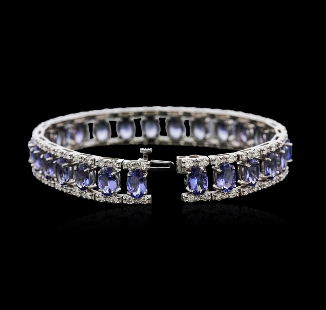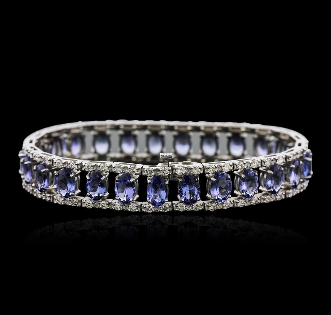 One electronically tested 14KT white gold ladies cast tanzanite and diamond bracelet with a hidden box clasp with a bright polish finish. Measurements: 7" in length Identified with markings of "14K". Condition is new. Containing: Twenty-five prong set oval modified brilliant cut natural tanzanites, measuring 7.00 x 5.30 x 3.45mm, approximate total weight of 22.50ct., clarity is eye clean, type I, medium light, very slightly grayish, violet color, (GIA V 4/3), cut is good. One Hundred prong set round brilliant cut diamonds, measuring 2.00 - 2.00 x 1.20mm (depth est.) approximate total weight of 100 Stones = 2.92ct. Clarity: SI-1 to SI-2. Color: I - J, Cut is Good. Colored gemstones are presumed to have been subjected to commonly used enhancement processes. All diamonds and colored gemstones are graded in the mounting, unless otherwise stated. Total Weight of Colored Stones 22.50ct. Total Weight of Diamonds 2.92ct. Total Weight of Bracelet 27.40 grams. GGL Appraised at $14,095.00.