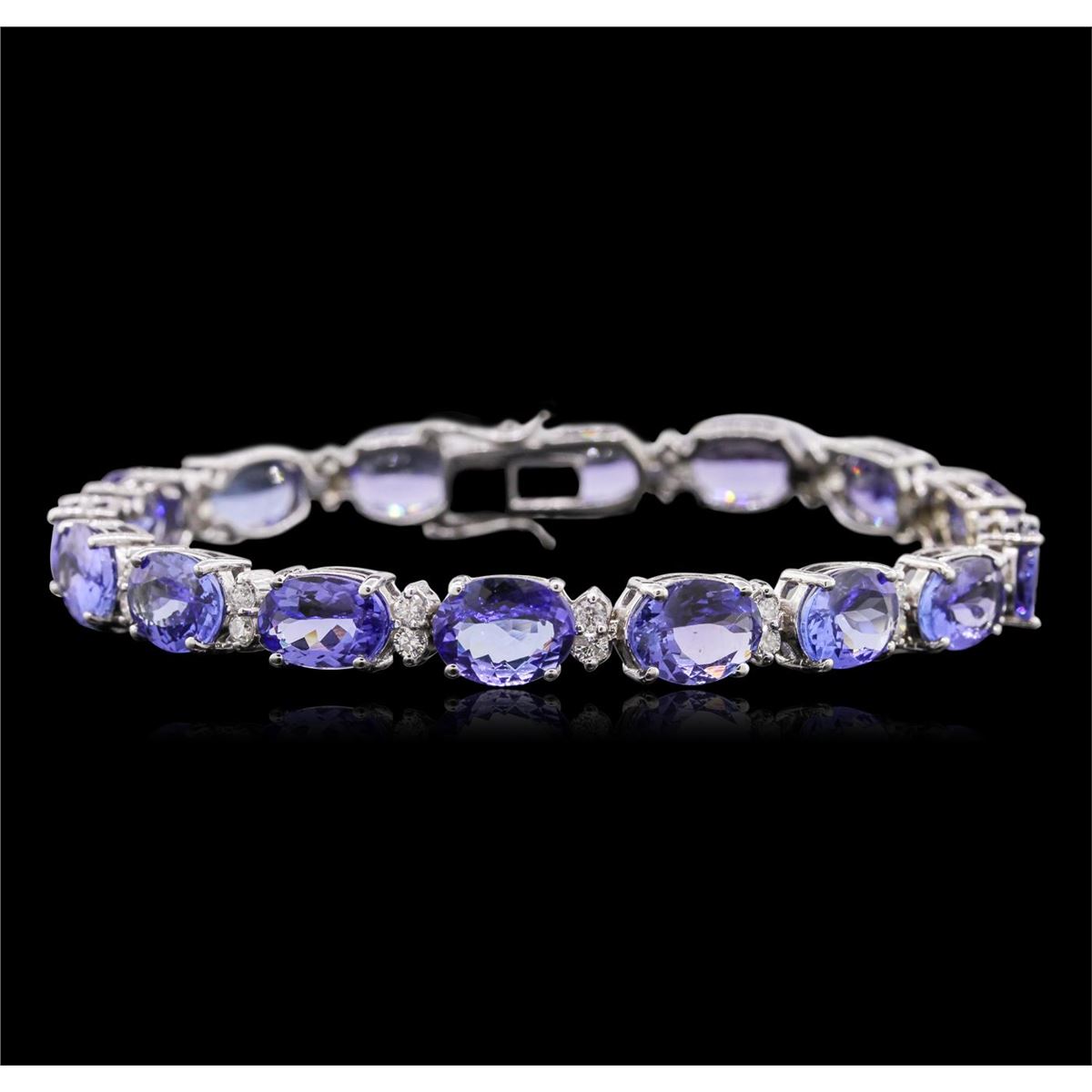 One electronically tested 14KT white gold Ladies combination cast & assembled bracelet with a hidden box clasp with a bright polish finish. Condition is new. Measurements: 7" in length. Identified with markings of "14K". Containing: Sixteen prong set oval modified brilliant cut natural tanzanites, measuring 8.80 x 6.70 x 3.50mm, approximate. Total Weight of 22.56ct., clarity is eye clean, type I, medium light, moderately strong, violet color, (GIA V 4/4), cut is very good. Colored gemstones are presumed to have been subjected to commonly used color/clarity enhancement processes. Thirty-Two prong set round brilliant cut diamonds, measuring 2.00 - 2.00 x 1.20mm (depth est.) approximate. Total Weight of 32 Stones = 1.00ct. Clarity: SI-2 to I-1. Color: H - I, Cut is Very Good. Total Weight of Colored Stones 22.56ct. Total Weight of Diamonds 1.00ct. Total Weight of Bracelet 18.60 grams. GGL Appraised at $39,195.00.