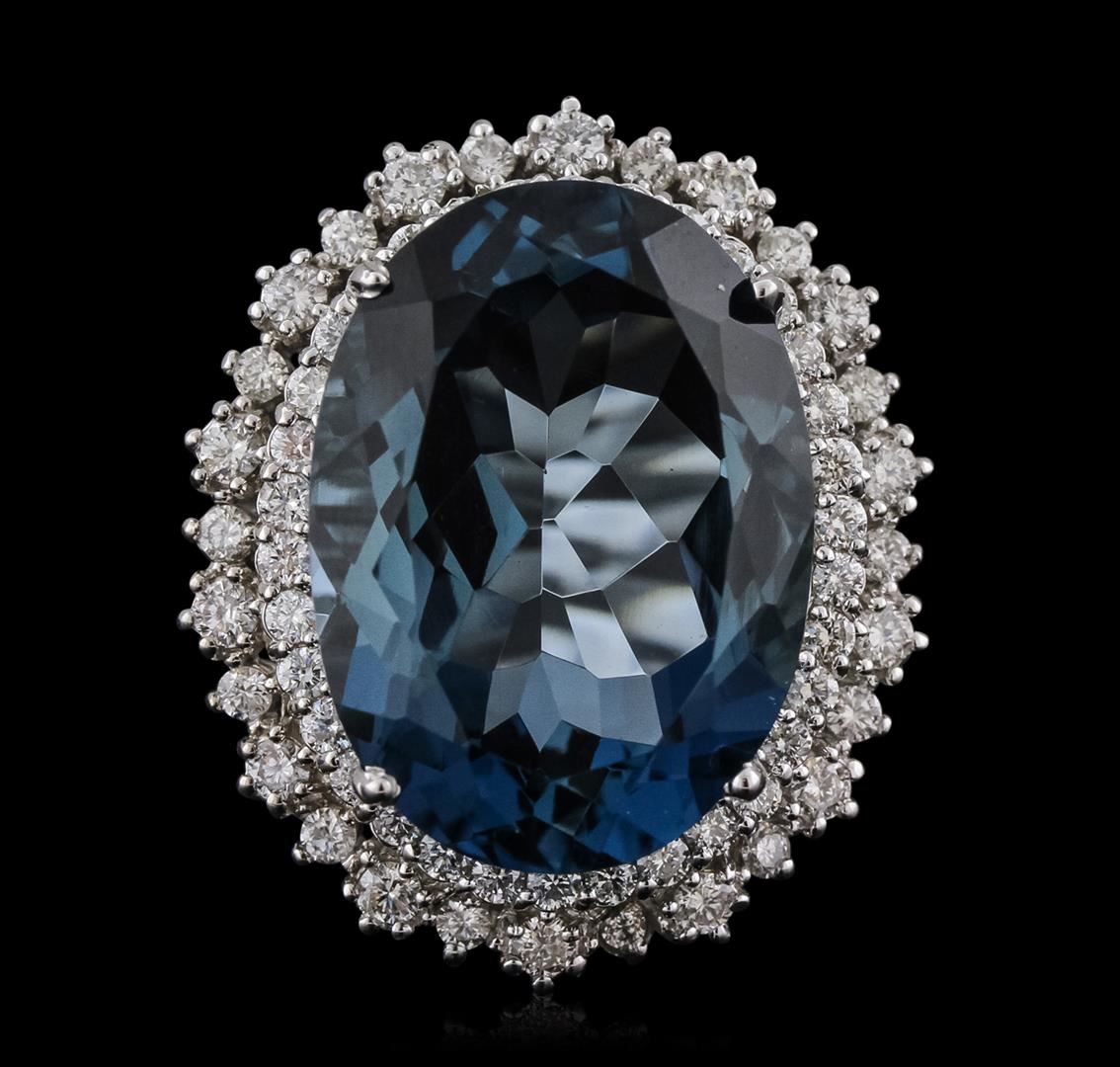 One electronically tested 14KT white gold ladies combination cast & assembled topaz and diamond ring with a flat shank with a bright polish finish. Identified with markings of "K14". Condition is new. Containing: One prong set oval modified brilliant cut natural blue topaz, measuring 21.67 x 15.97 x 9.13mm, approximate weight of 22.83ct., clarity is eye clean, type I, medium, very slightly grayish, blue color, (GIA B 5/3), cut is good. Sixty-Two prong set round brilliant cut diamonds, measuring 2.00 - 1.50 x 1.05mm (depth est.) approximate total weight of 62 Stones = 1.22ct. Clarity: SI-1 to I-1. Color: I - J, Cut is Good. Colored gemstones are presumed to have been subjected to commonly used enhancement processes. All diamonds and colored gemstones are graded in the mounting, unless otherwise stated. Total Weight of Colored Stones 22.83ct. Total Weight of Diamonds 1.22ct. Total Weight of Ring 14.90 grams. GGL Appraised at $5,040.00.