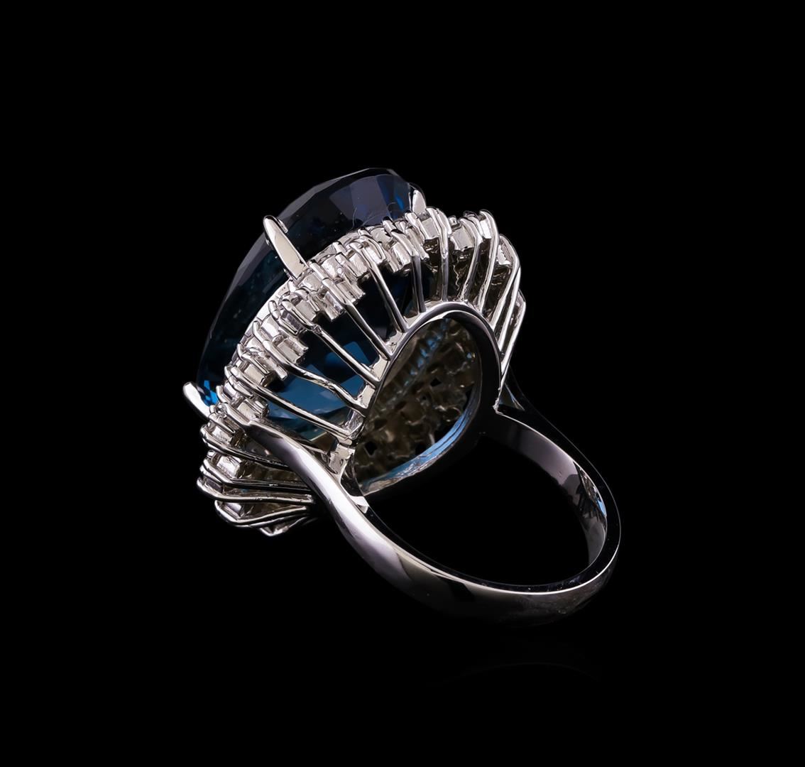 One electronically tested 14KT white gold ladies combination cast & assembled topaz and diamond ring with a flat shank with a bright polish finish. Identified with markings of "K14". Condition is new. Containing: One prong set oval modified brilliant cut natural blue topaz, measuring 21.67 x 15.97 x 9.13mm, approximate weight of 22.83ct., clarity is eye clean, type I, medium, very slightly grayish, blue color, (GIA B 5/3), cut is good. Sixty-Two prong set round brilliant cut diamonds, measuring 2.00 - 1.50 x 1.05mm (depth est.) approximate total weight of 62 Stones = 1.22ct. Clarity: SI-1 to I-1. Color: I - J, Cut is Good. Colored gemstones are presumed to have been subjected to commonly used enhancement processes. All diamonds and colored gemstones are graded in the mounting, unless otherwise stated. Total Weight of Colored Stones 22.83ct. Total Weight of Diamonds 1.22ct. Total Weight of Ring 14.90 grams. GGL Appraised at $5,040.00.