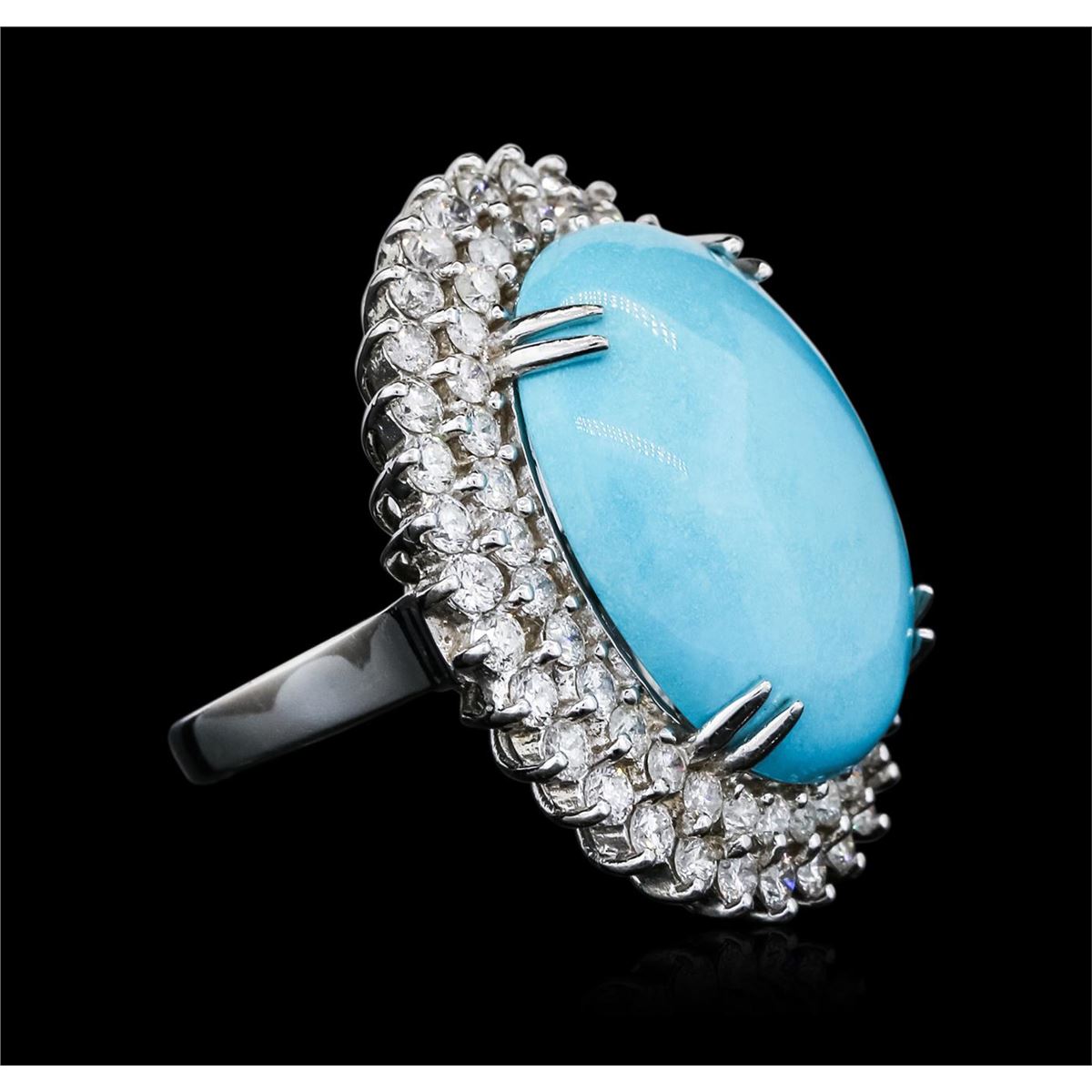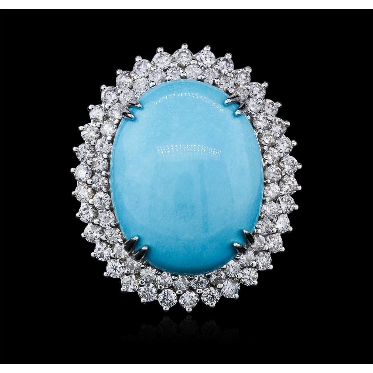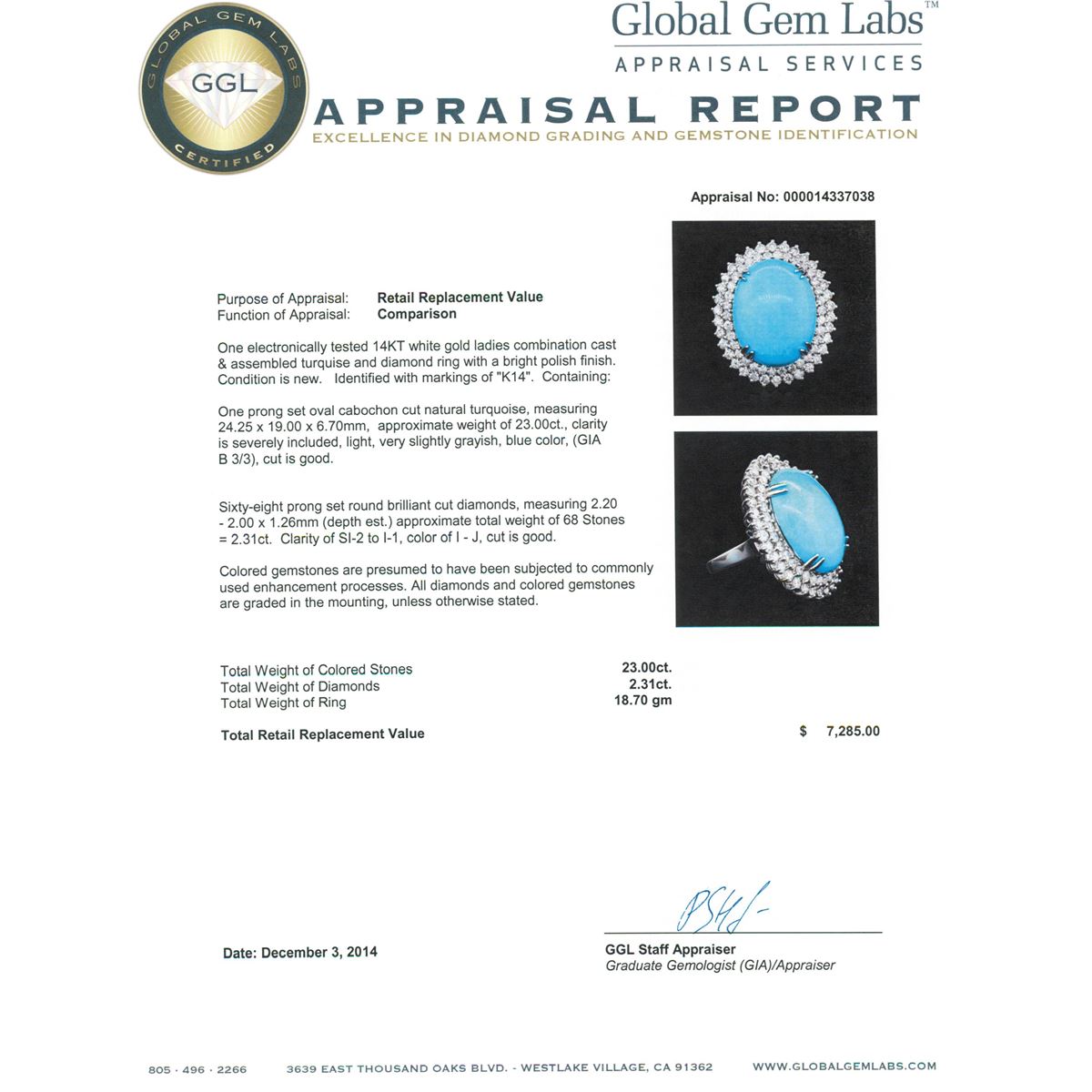 One electronically tested 14KT white gold ladies combination cast & assembled turquoise and diamond ring with a bright polish finish. Identified with markings of "K14". Condition is new. Containing: One prong set oval cabochon cut natural turquoise, measuring 24.25 x 19.00 x 6.70mm, approximate weight of 23.00ct., clarity is severely included, light, very slightly grayish, blue color, (GIA B 3/3), cut is good. Sixty-Eight prong set round brilliant cut diamonds, measuring 2.20 - 2.00 x 1.26mm (depth est.) approximate total weight of 68 Stones = 2.31ct. Clarity: SI-2 to I-1. Color: I - J, Cut is Good. Colored gemstones are presumed to have been subjected to commonly used enhancement processes. All diamonds and colored gemstones are graded in the mounting, unless otherwise stated. Total Weight of Colored Stones 23.00ct. Total Weight of Diamonds 2.31ct. Total Weight of Ring 18.70 grams. GGL Appraised at $7,285.00.